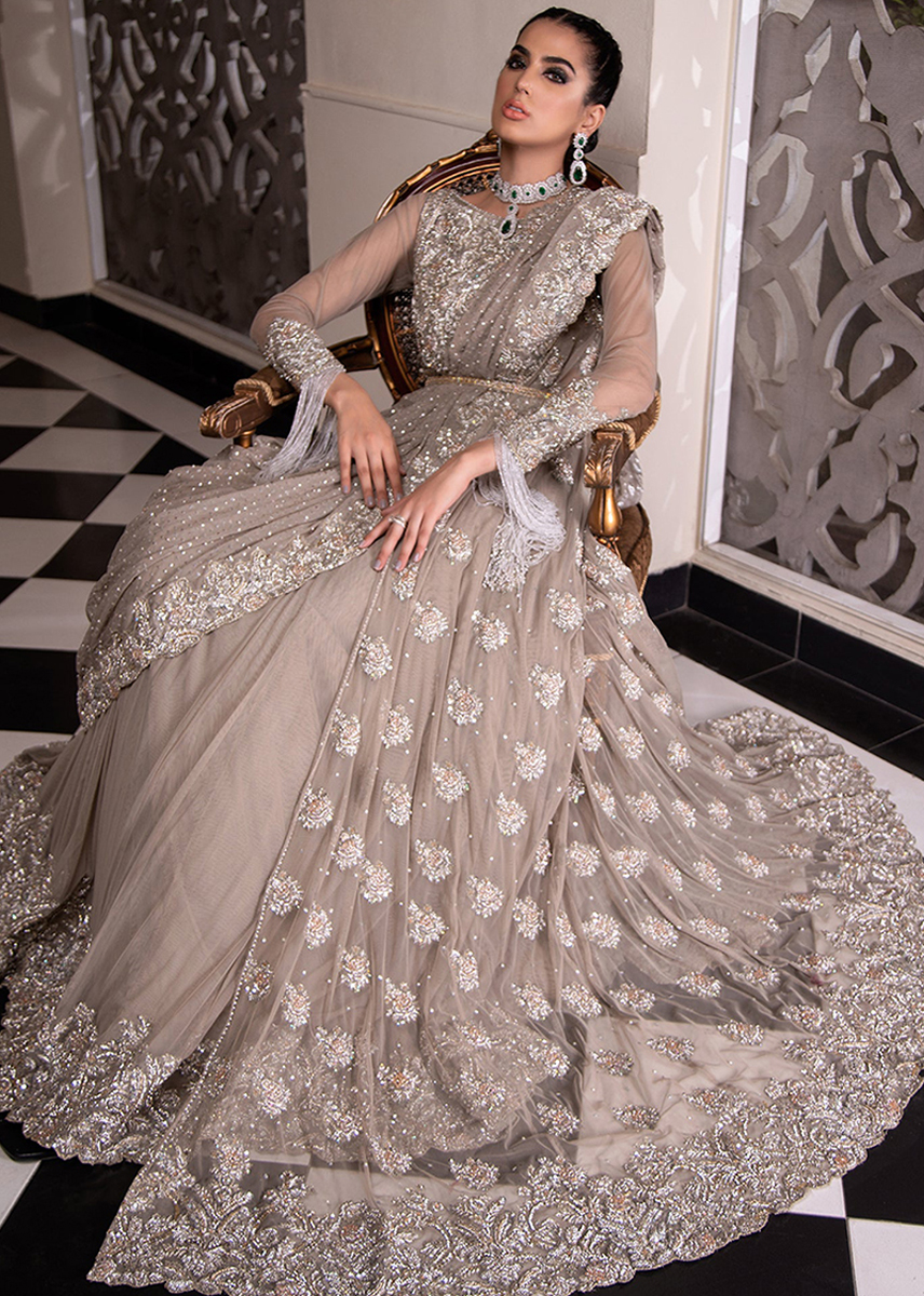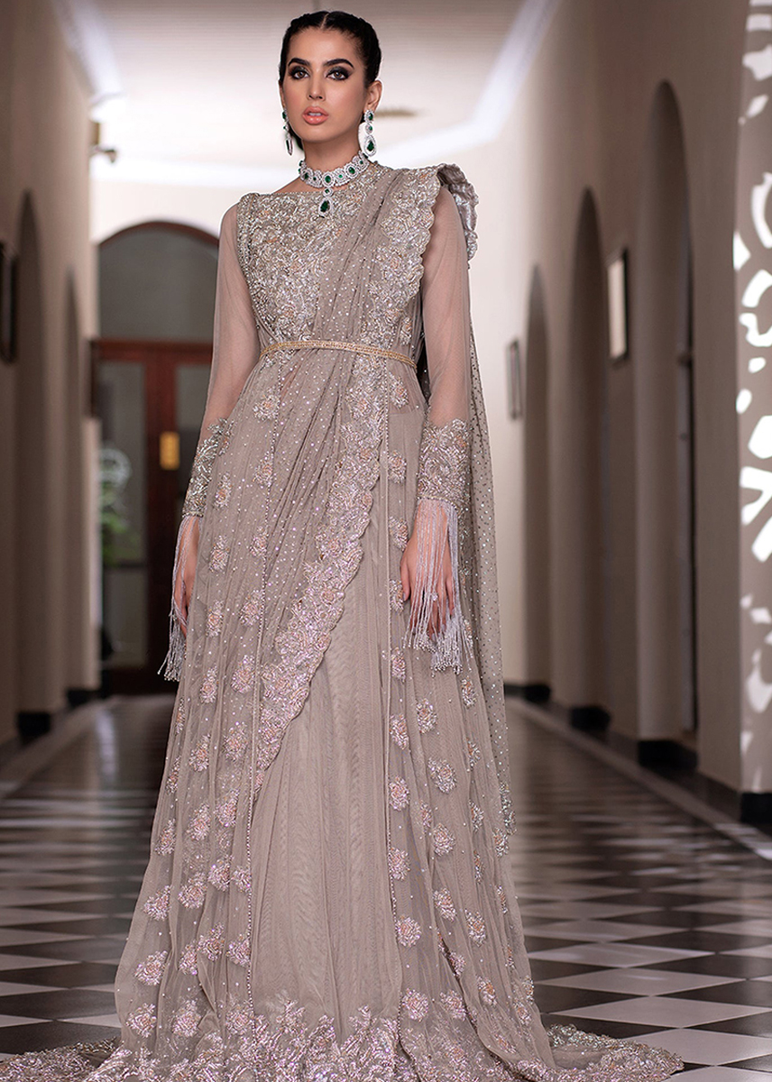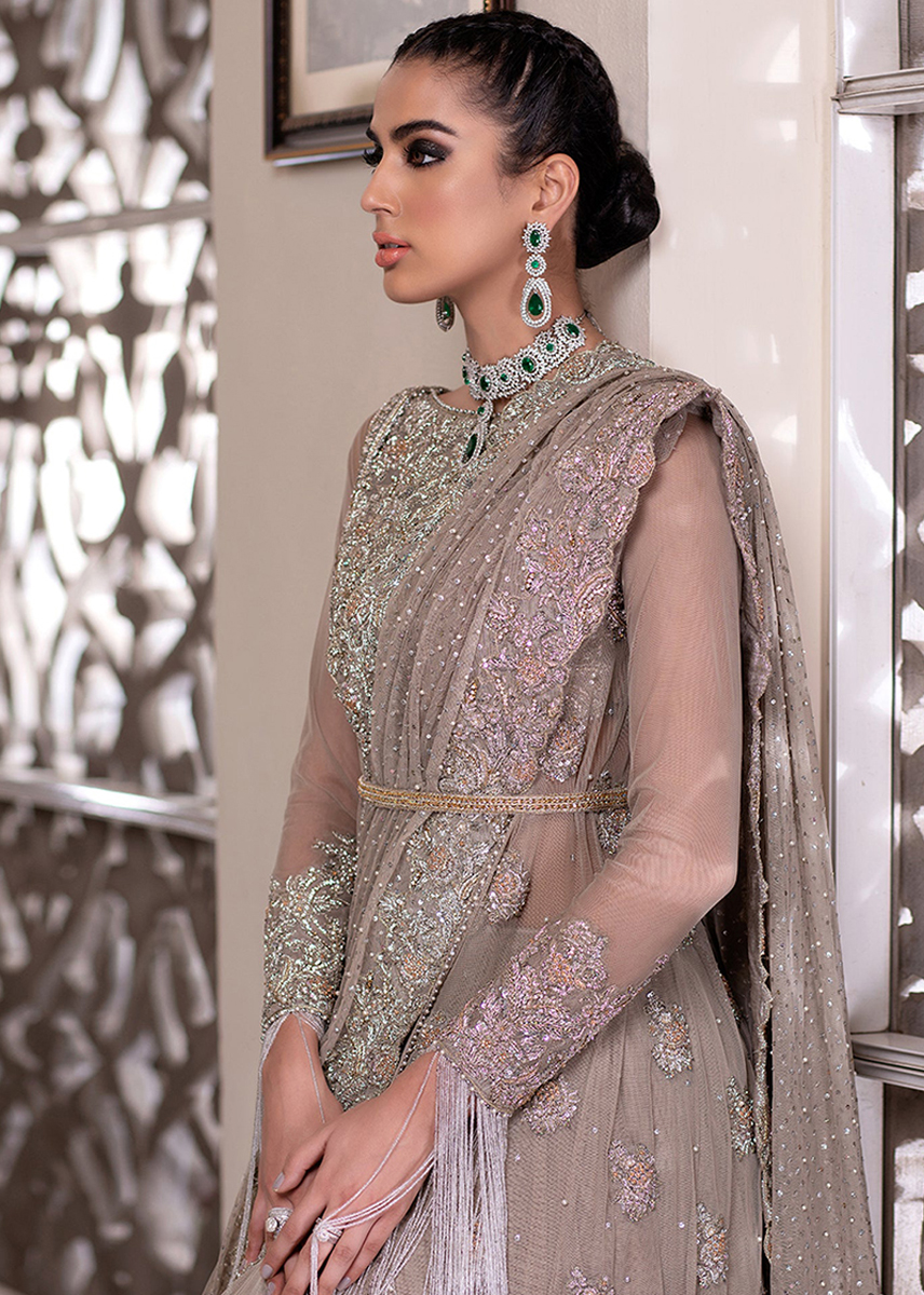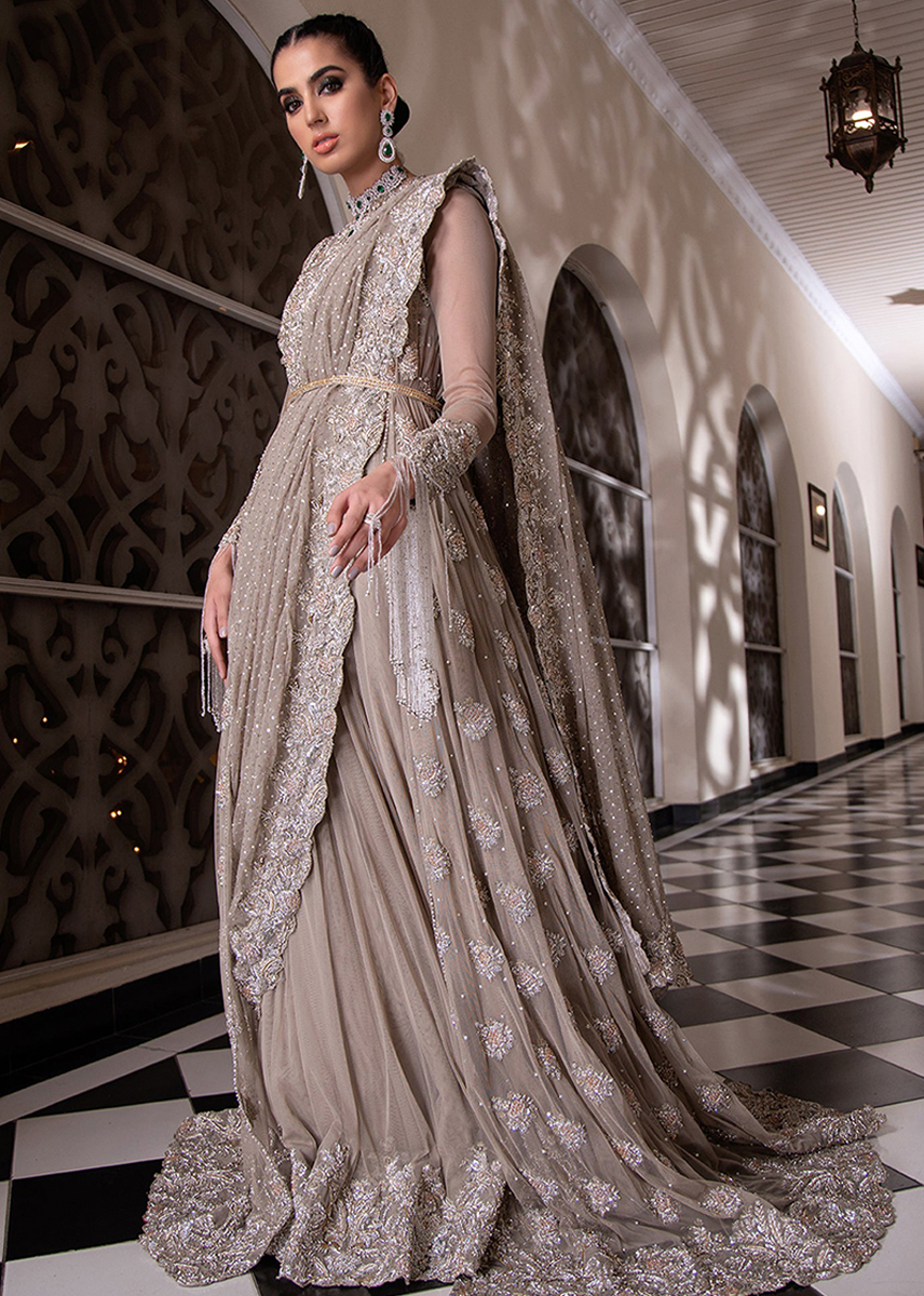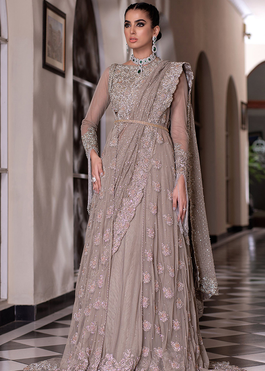 This beautiful dusky beige Outfit is redefining the traditional wear with the modern touch of Front open Floor Length Gown with eye catchy heavy embellished work adorned with floral choli motifs sprawled across the gown completed with a sequins shimmery dupatta which elevates eastern flavor.