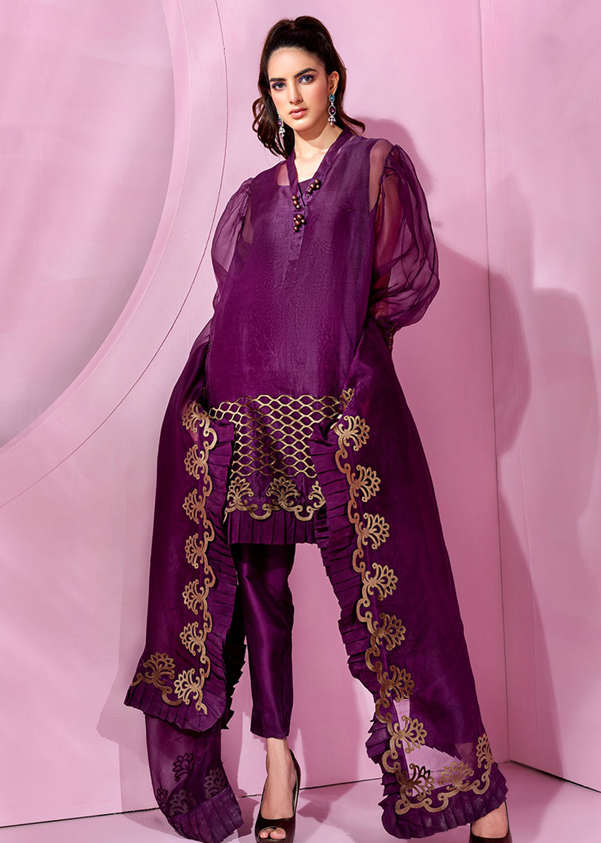Pure organza shirt with golden cut work on the border finished with finely handcrafted silk pleats.