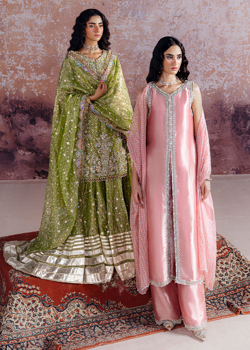 Ayda is a radiant dialogue between heritage and modernity. The silhouette unfolds in gleaming tissue,with a front-open cut, traced with intricate handwork that runs along the sides and armholes, lending a sculptural sharpness to its fluid form. A sheer tissue dupatta drifts effortlessly with its surface scattered with crsytals that sparkles like stardust dissolving into a pale horizon. Flowing beneath the wide flared tissue pants descend into a refined border, their subtle gleam lending structure and refinement to the ensemble’s airy grace.