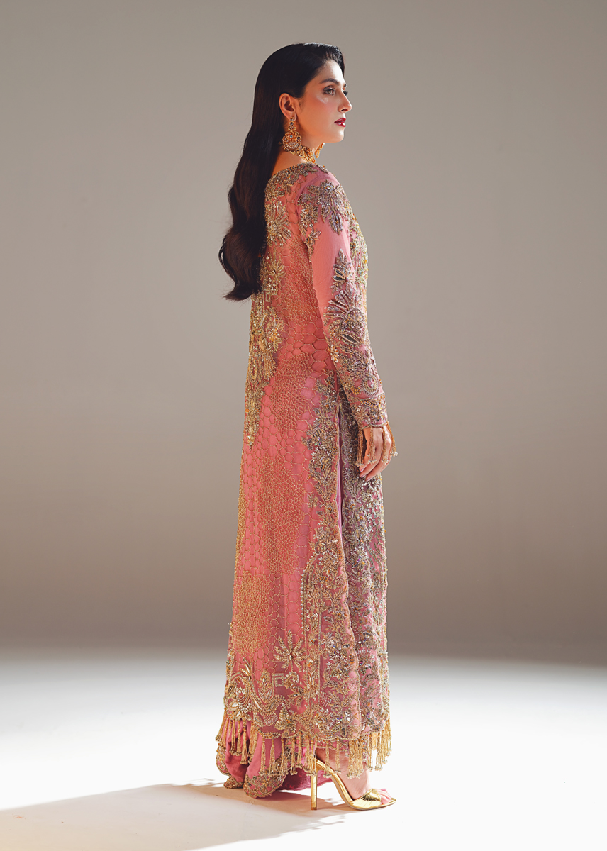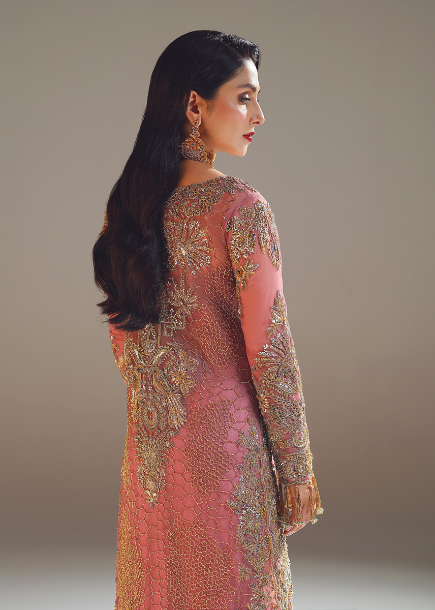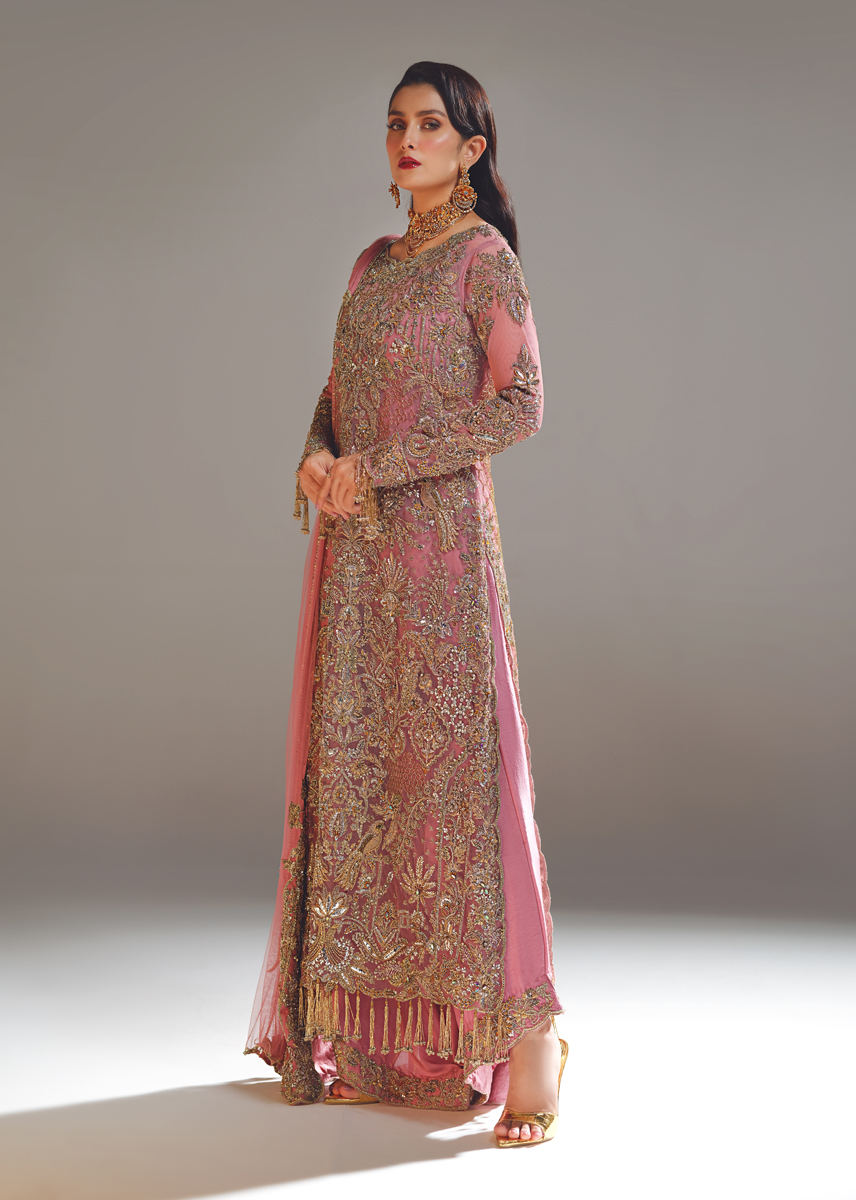 The unique drape of the dupatta, with the birds perched on the shoulder and the tassels swaying, tells a story of a bird's journey, from the stillness of morning to the freedom of flight. Completing this exquisite outfit are the flared pure silk V cut pants that flow gracefully with every step, creating an ethereal silhouette. They offer comfort and movement while maintaining an air of elegance.