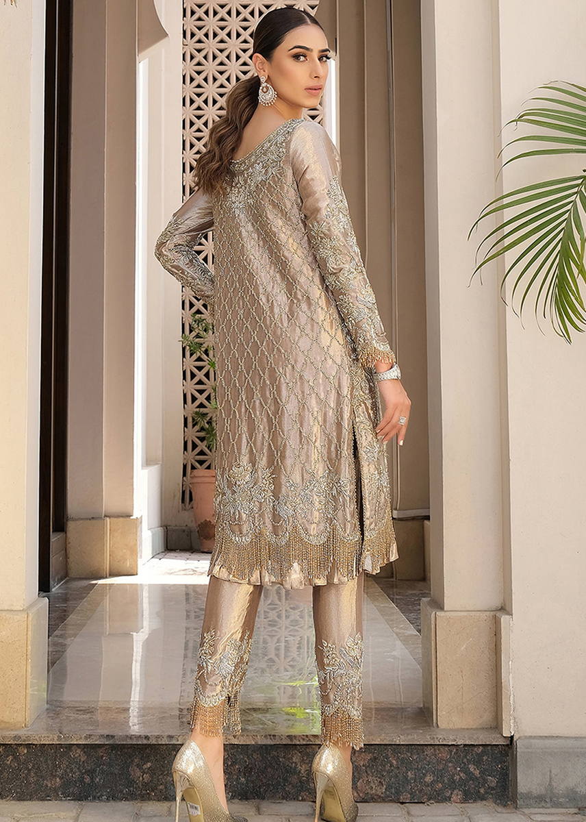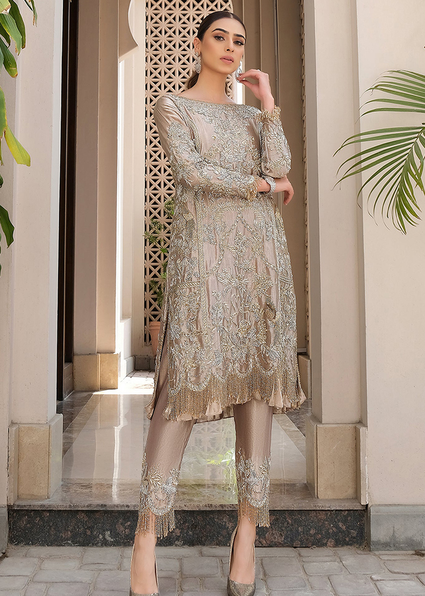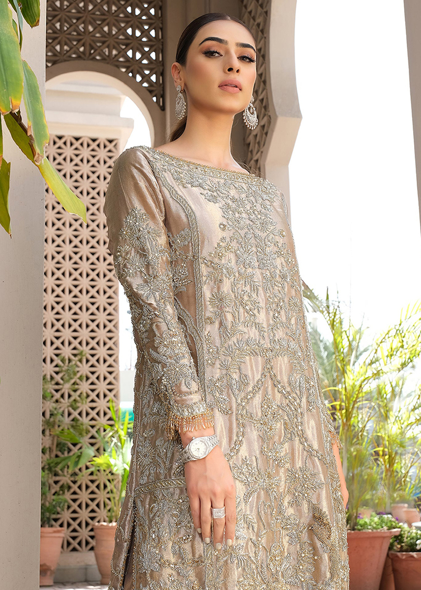 Evoking a new sleek look this season with subtle stylish cuts, Champagne gold shirt paired with equally embellished pants bejeweled with fine handcrafted details and pearls.
