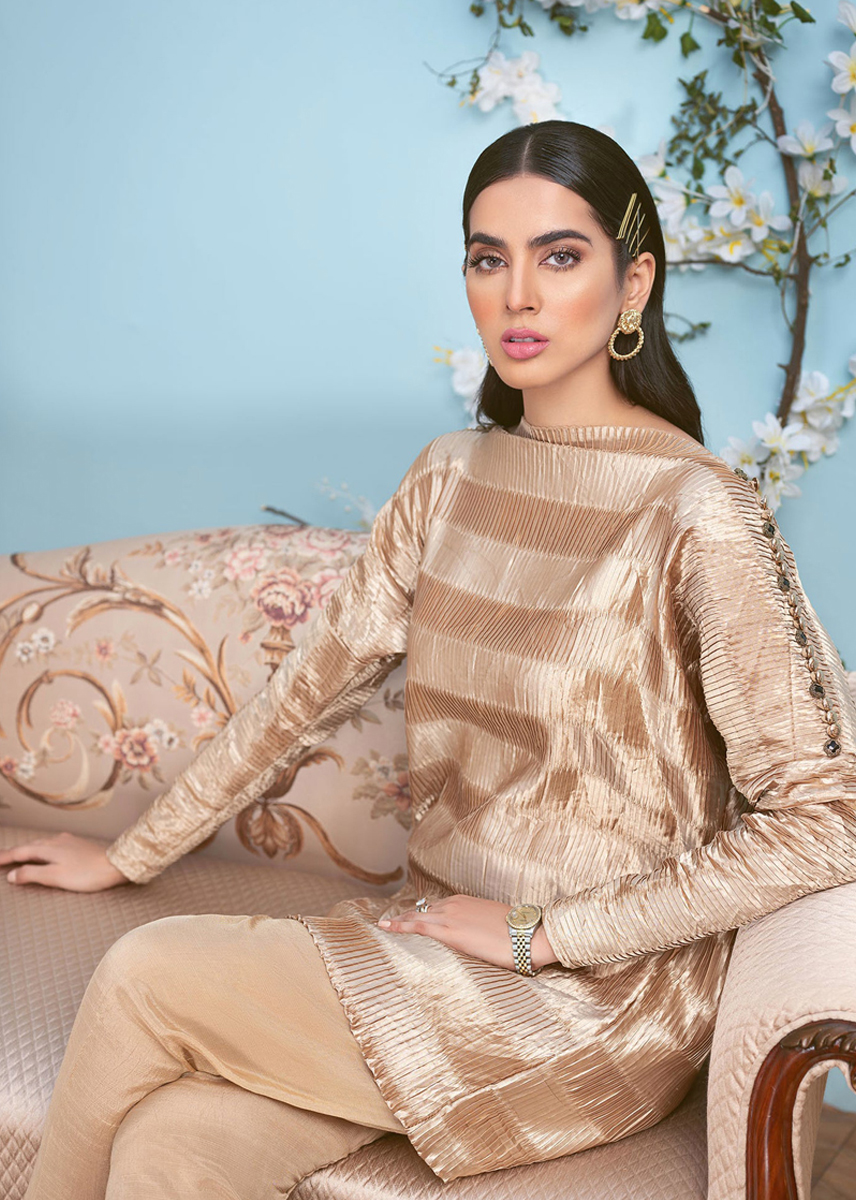 This champagne pleated batwing ensemble in stitching is adorned with gold and black metallic buttons. The bang on trend look is completed with a monotone pant shalwar radiating a minimalistic yet chic vibe.