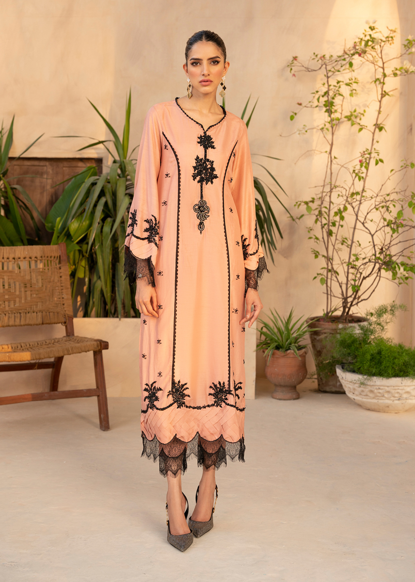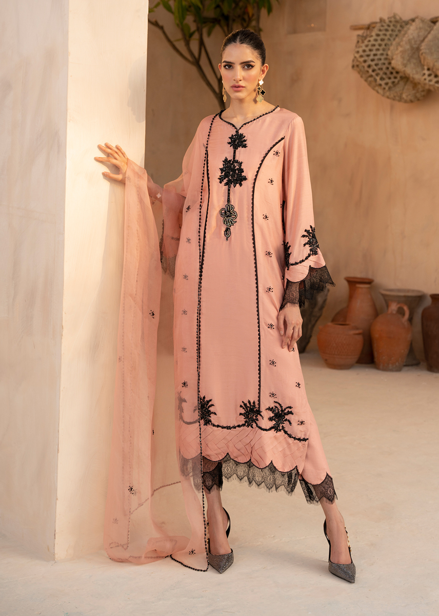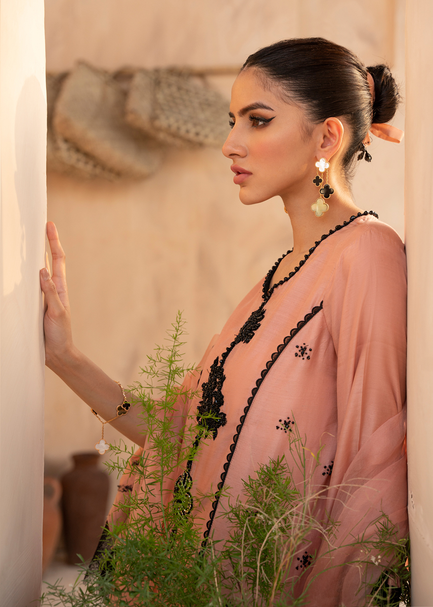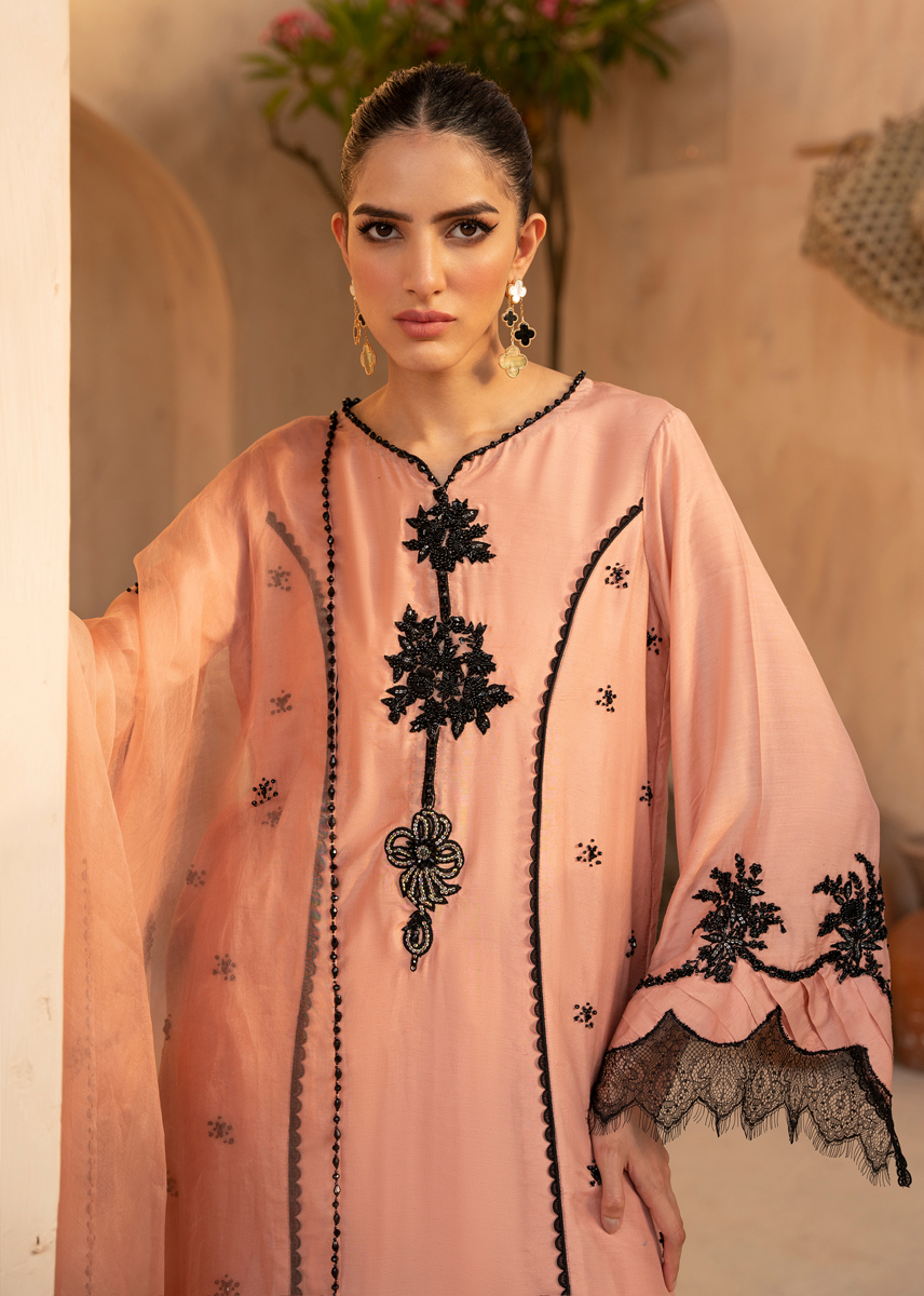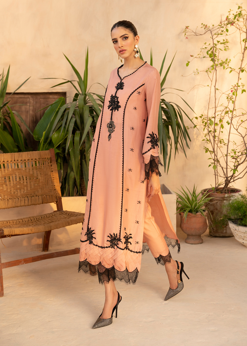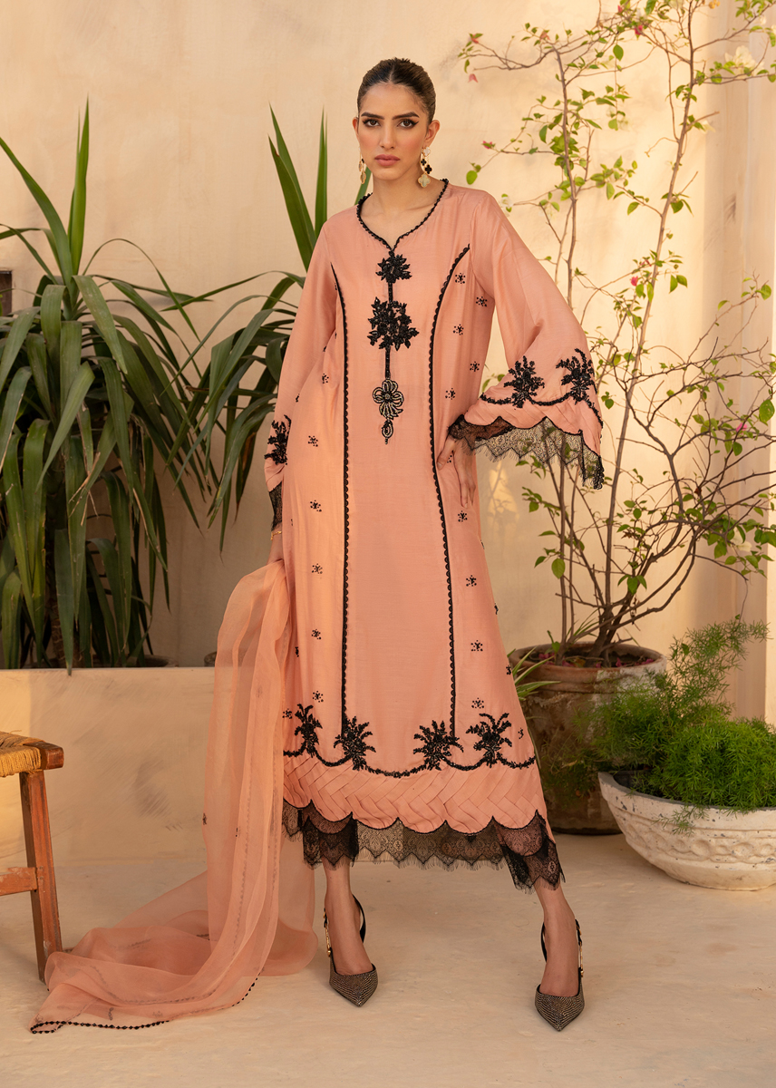 A soft salmon pink silk canvas embellished with black crystal bouquets on the neckline and hem accentuated with hand curated pleat work. The side panels are laden with a crystal spray. The shirt and trousers are finished with a Chantelle fringe. The scintillating look is completed with an airy dupatta with splashed noir crystal and edging.