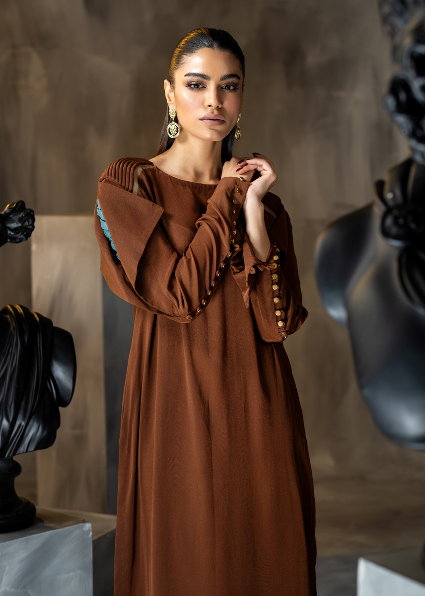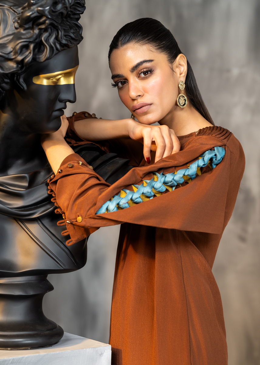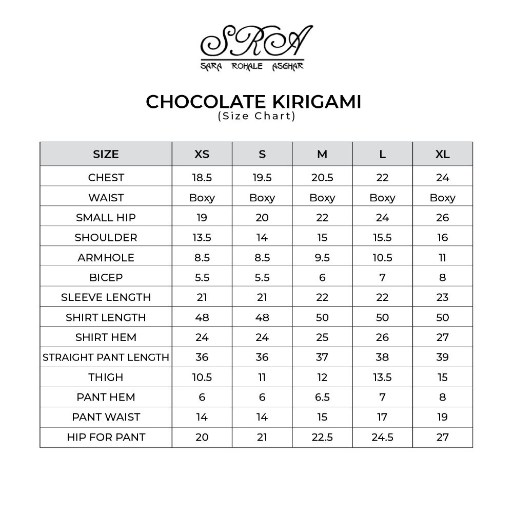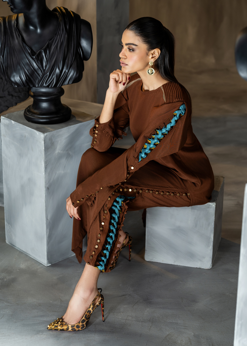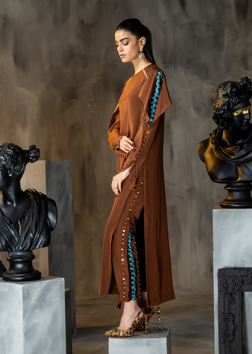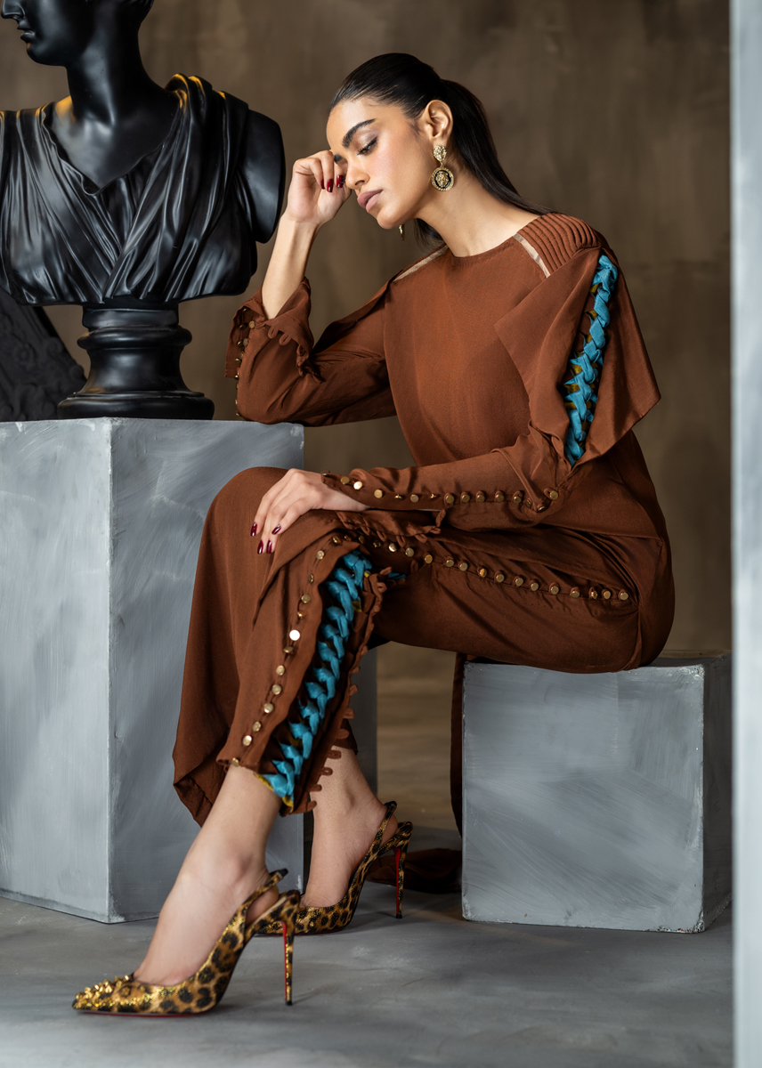 Chocolate Kirigami is a two piece ensemble displaying mastery in stitching and techniques of fabrication. Statement kirigami in fungus yellow and nile blue peeps through silk flaps on the sleeves and pants. The style is sealed with golden buttons. Textured lines on the shoulders further elevate the classic silhouette, making it a fashionably tall this season.