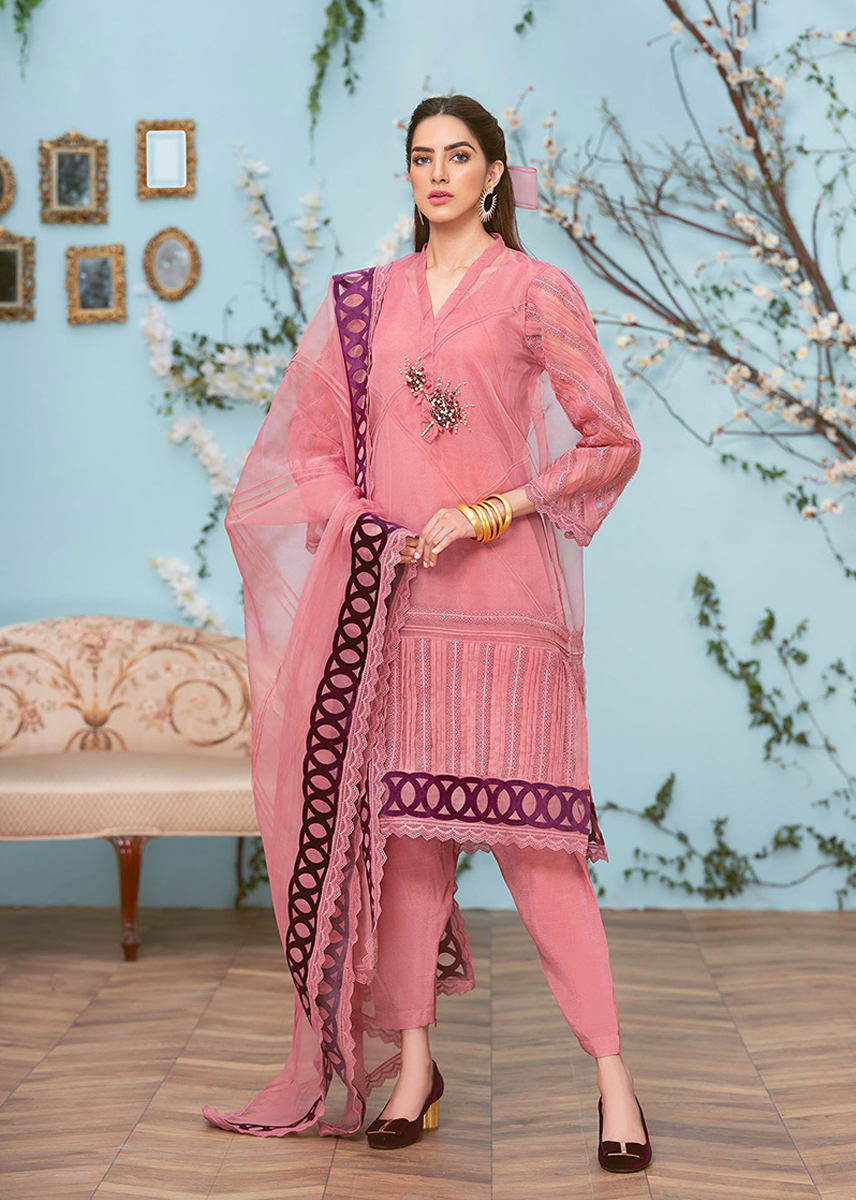 This phalsa ,sorbet pink, sheer organza outfit is a definite must have this summer. It's delicate 3D crystal and pearl bunches give oomph to the simple neckline along with lace, pleating and cutwork used for it's ormentation. The outfit is completed with a silk pant shalwar ensuring style, comfort and a statement outfit for this Eid.