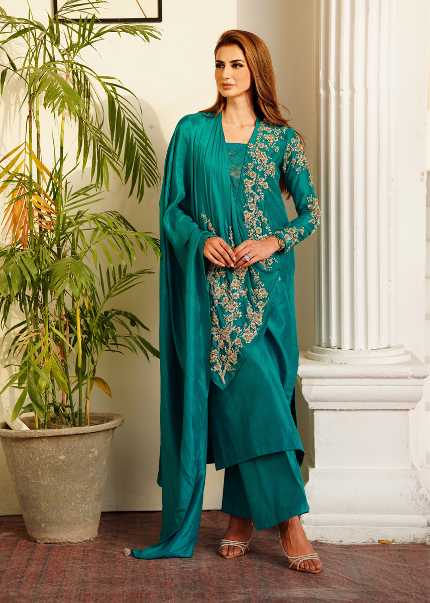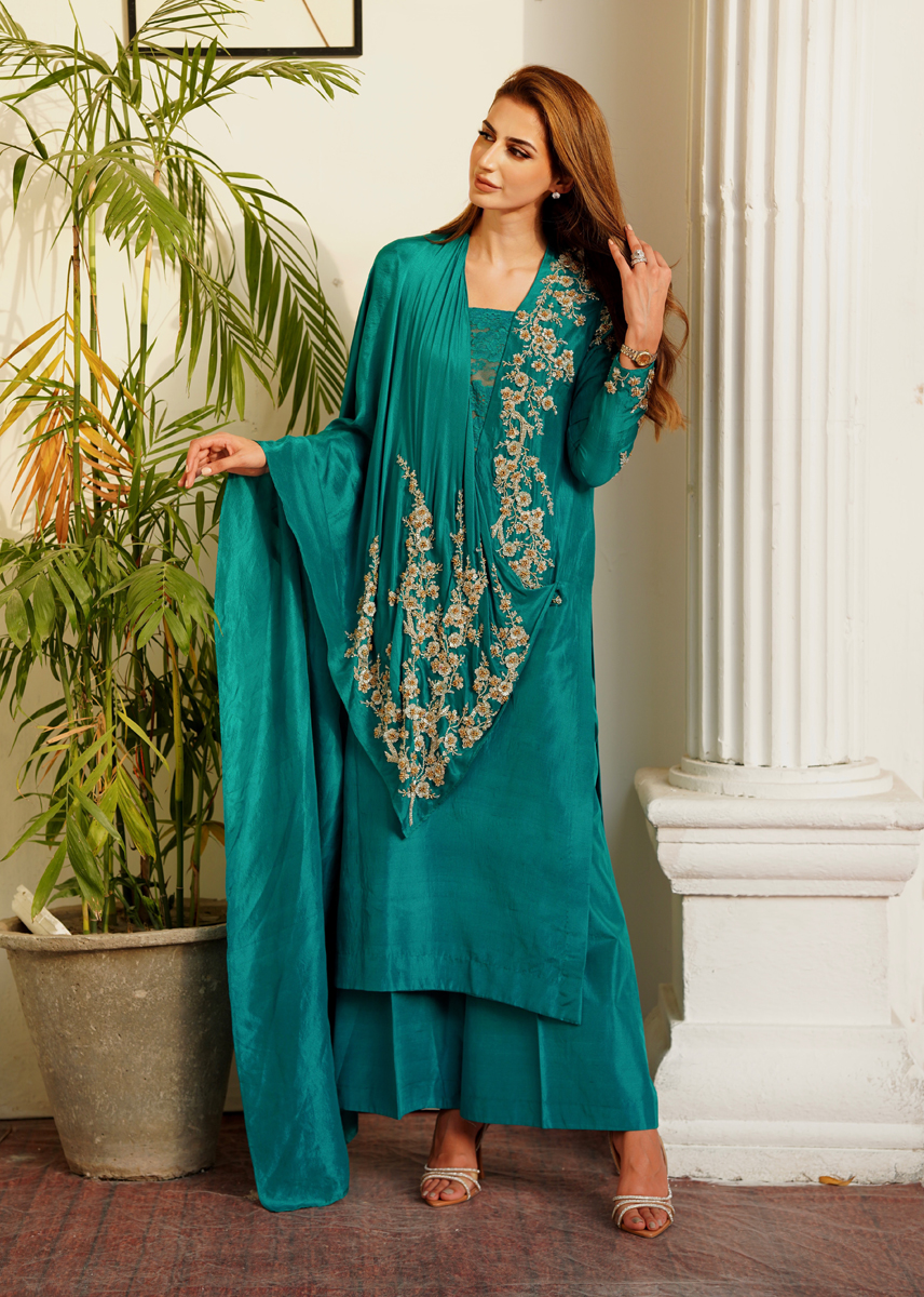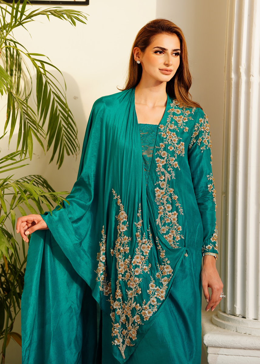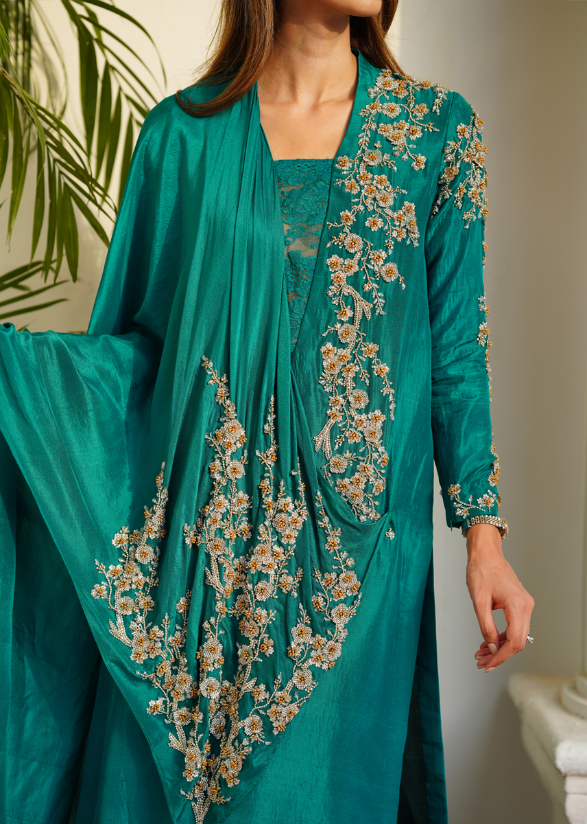 Crystal Mirage is an outfit in the enchanting shade of turquoise green crafted entirely from pure silk. This outfit celebrates luxurious comfort and nature's vibrant hue. It features a flowing shirt that drapes gracefully over the shoulder creating an ethereal silhouette that captures the essence of feminity and regal charm. The hand embellished crystal and mesh vines are intricately arranged mimicking the glistening cherry blossoms in spring. The neckline is accentuated with Chantilly lace while a loose silk pants completes the ensemble.
