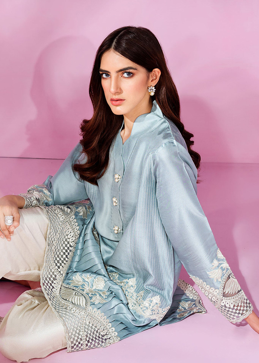 Pure raw silk kurta with scalloped neckline, pearl buttons and finely handcrafted pleats layered with lace work. The sides are paneled with stitch lines.
