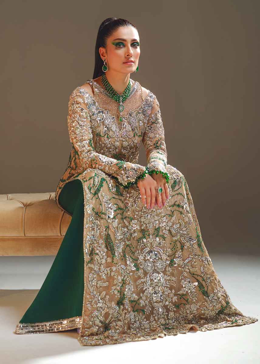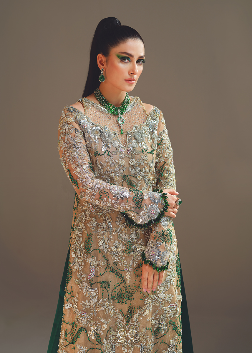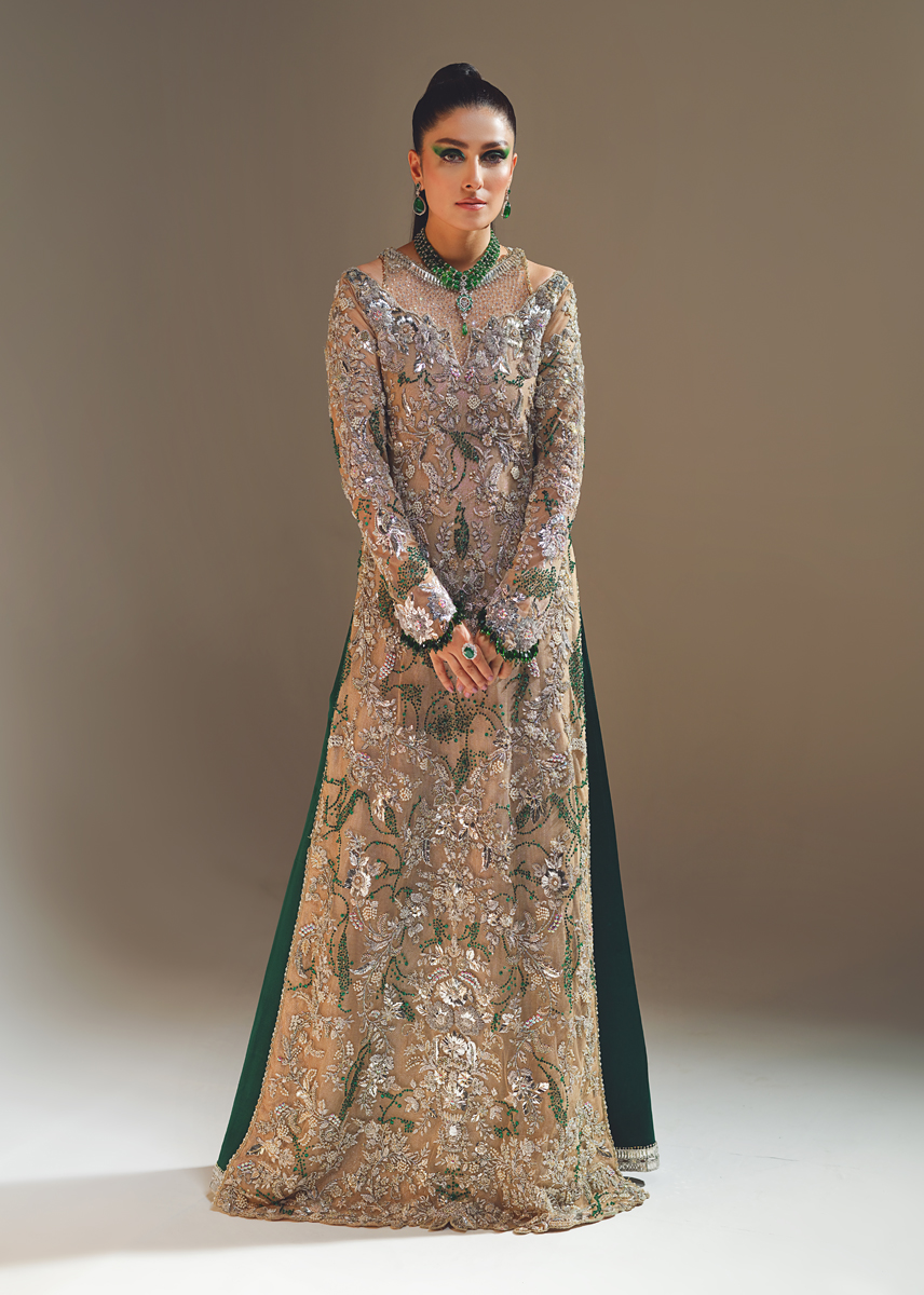 The "Enchantress" is a captivating ensemble that combines the natural beauty of skin tones with the alluring charm of bottle green satin pants, embellished with crystal details adding a touch of glamour and sparkle, further enhancing the overall allure of the outfit.