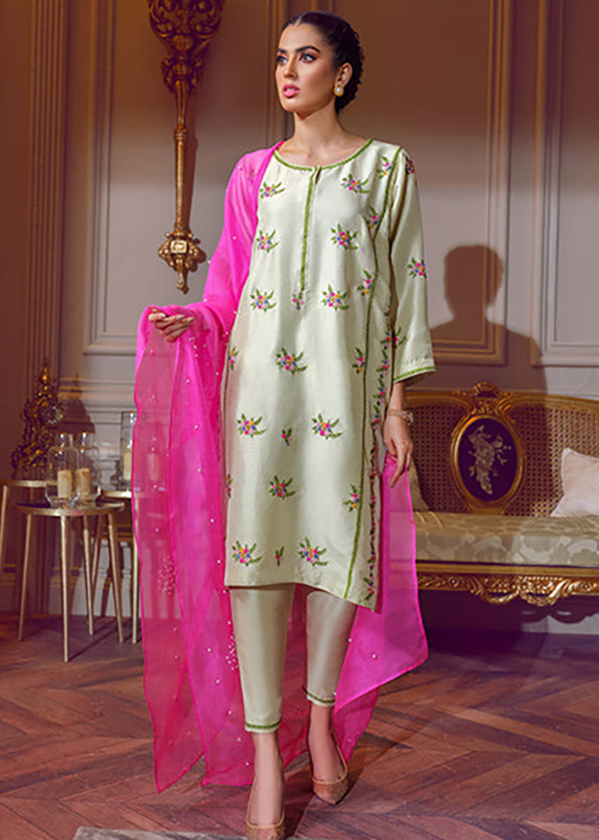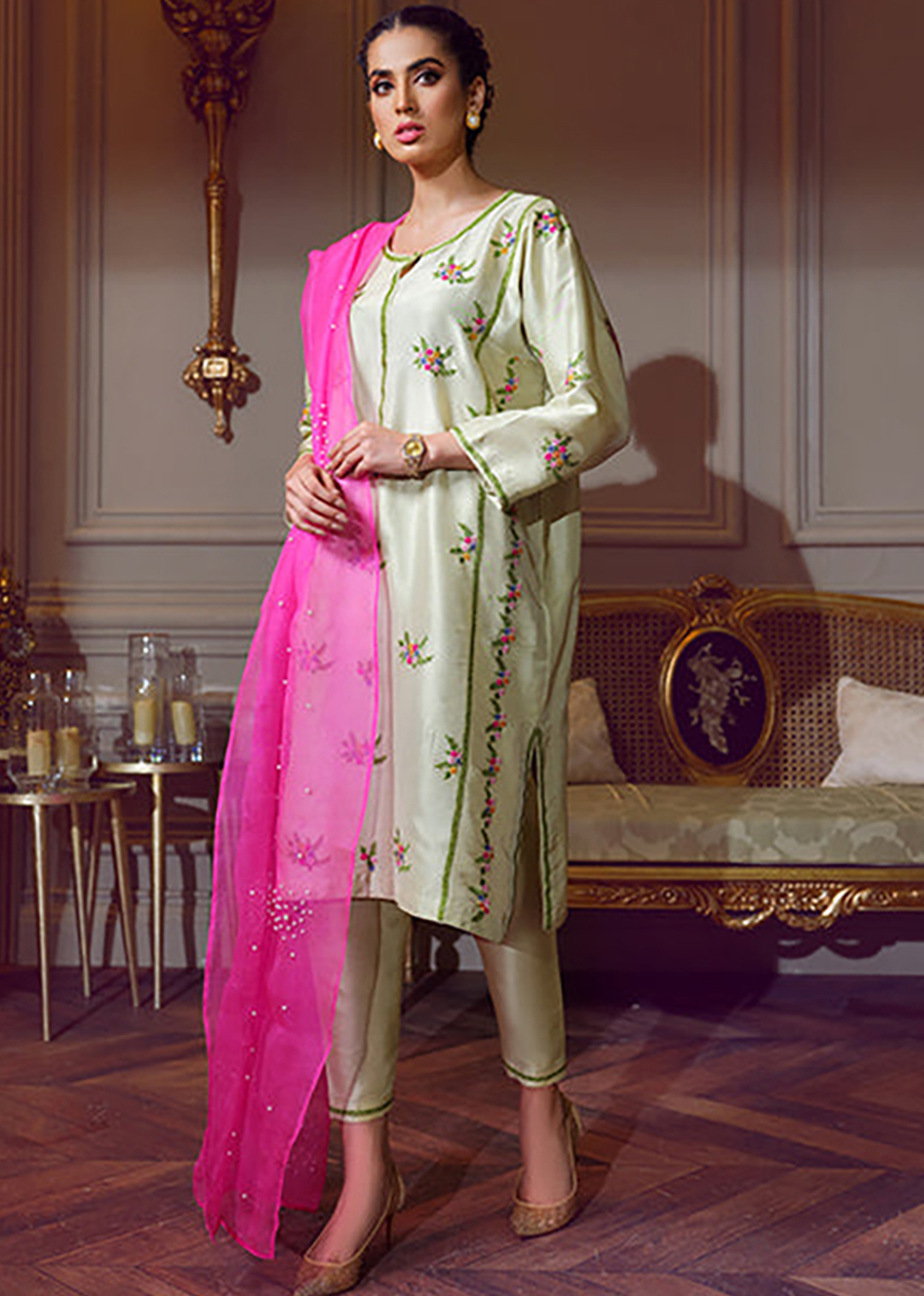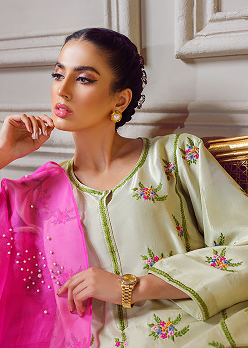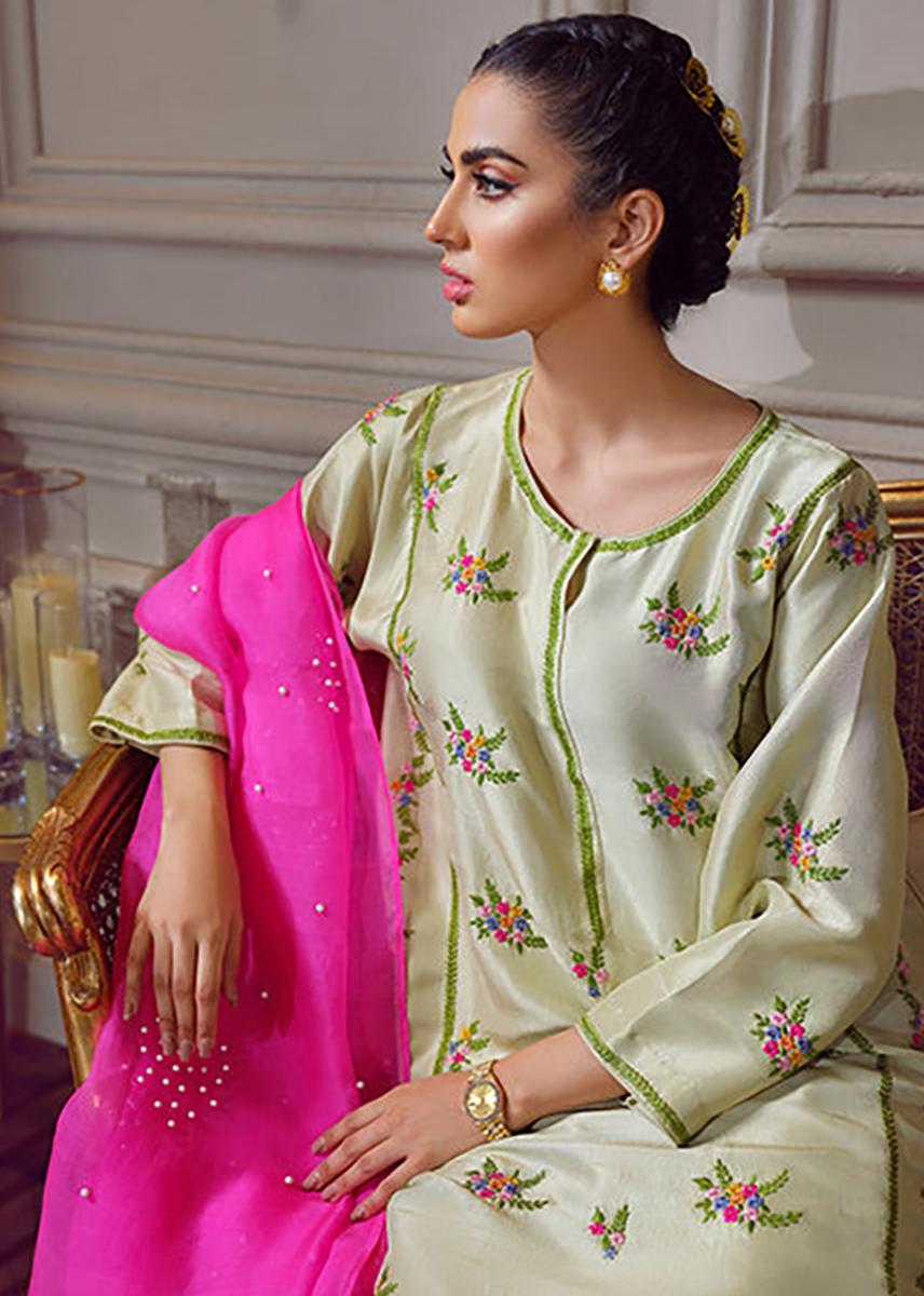 Floral blush is a 3 piece rawsilk ensemble with blush pink organza dupatta sprayed with pearls. Bunches of floral motives run through the classic kurta, completing the look with a shalwar with embroidered hemline. This outfit holds true to the Eastern silhouette yet giving it a modern flavour with fresh colour palette and soft embroidery.