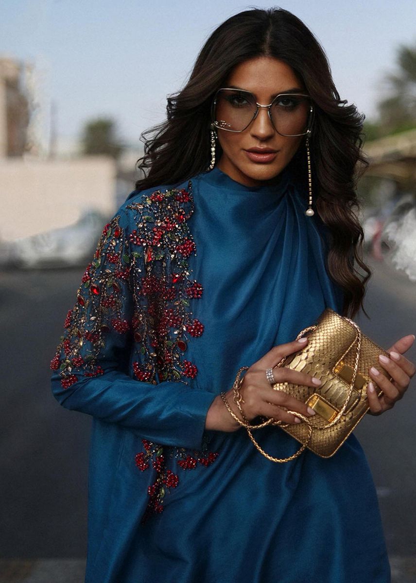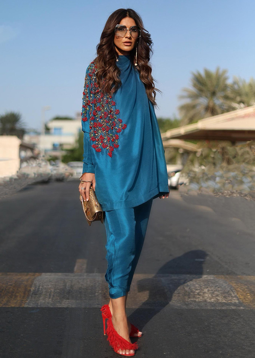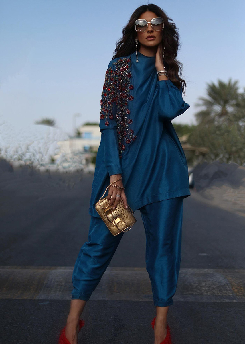 An aesthetic rendition of hand embellished vines sitting fashionably on a teal blue silk canvas. The shirt is further accentuated with a cowled neckline. Paired with silk shalwar, locks the fashionable ensemble for soiree this season