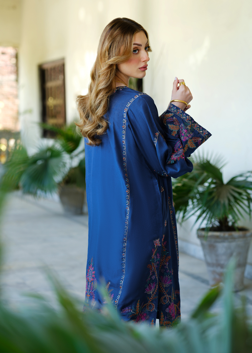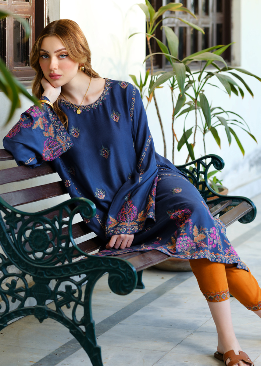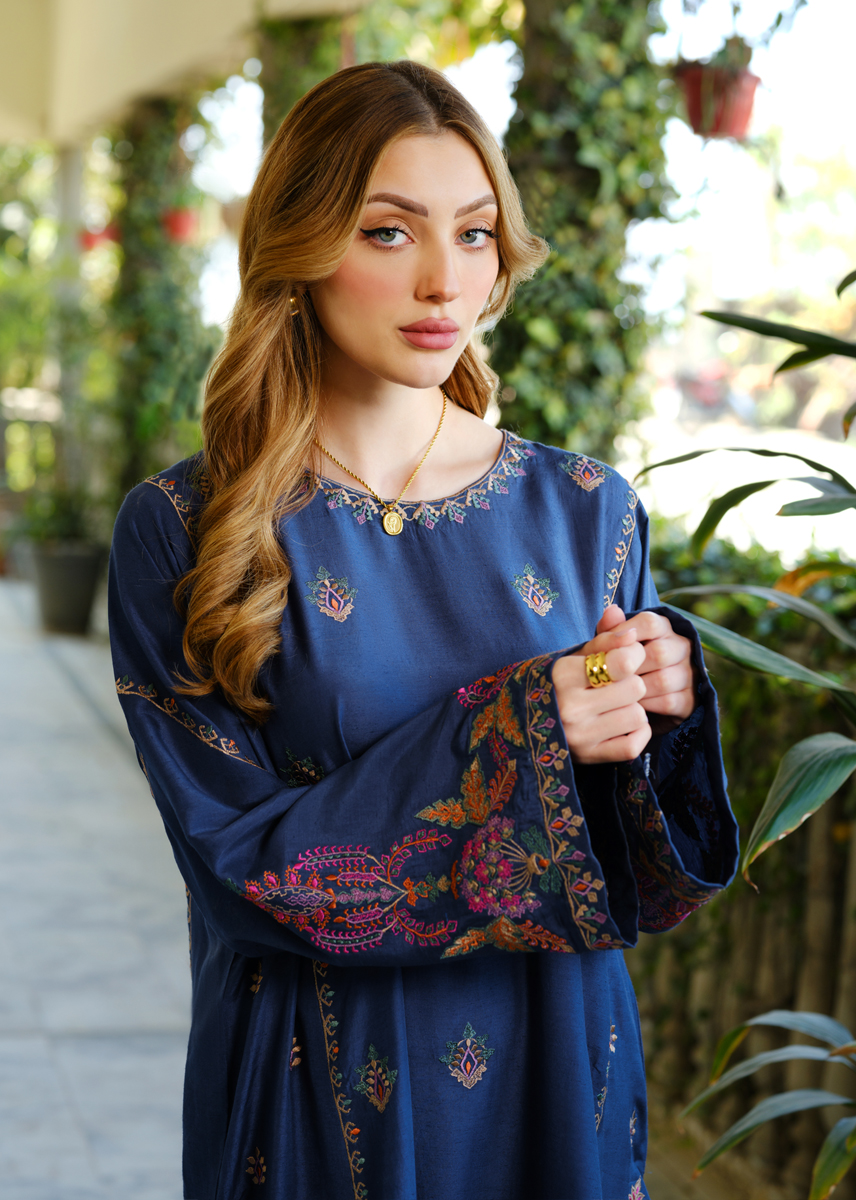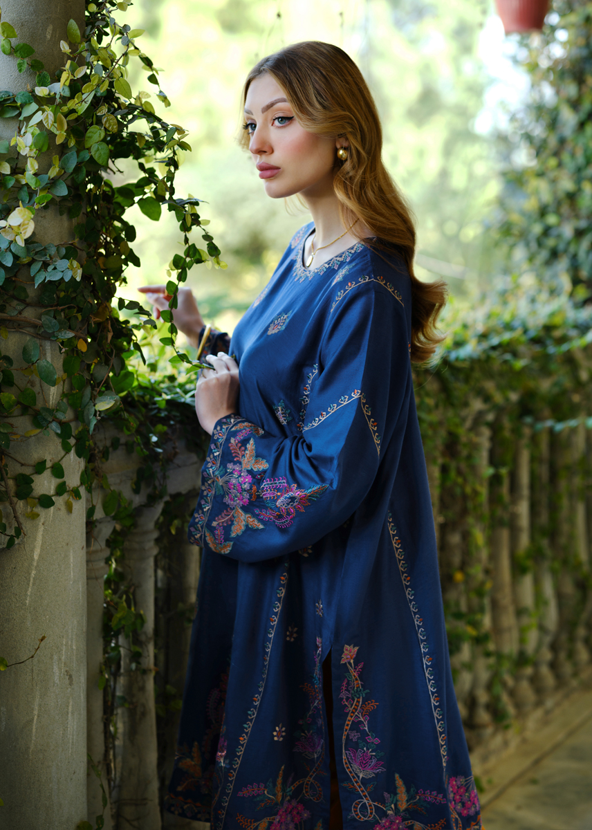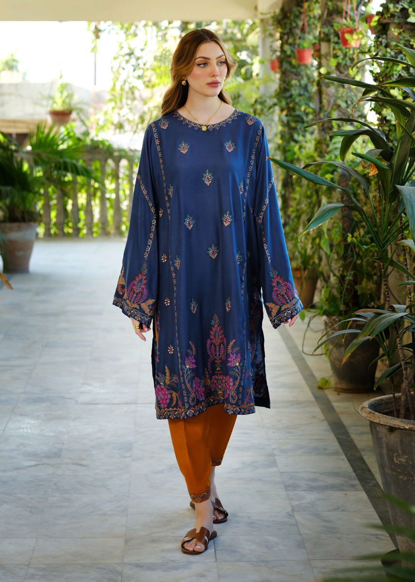 IRIS is a pure silk kurta sprawled with intricate floral pattern, imbibes essence of festivity. This sapphire kurta is paired with a contrast rust shalwar with details on the paincha making it the perfect choice.