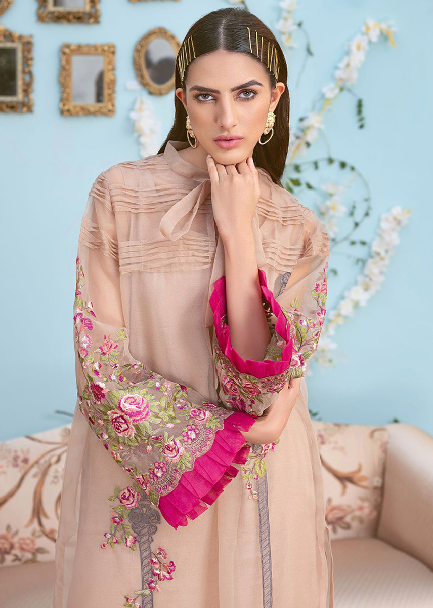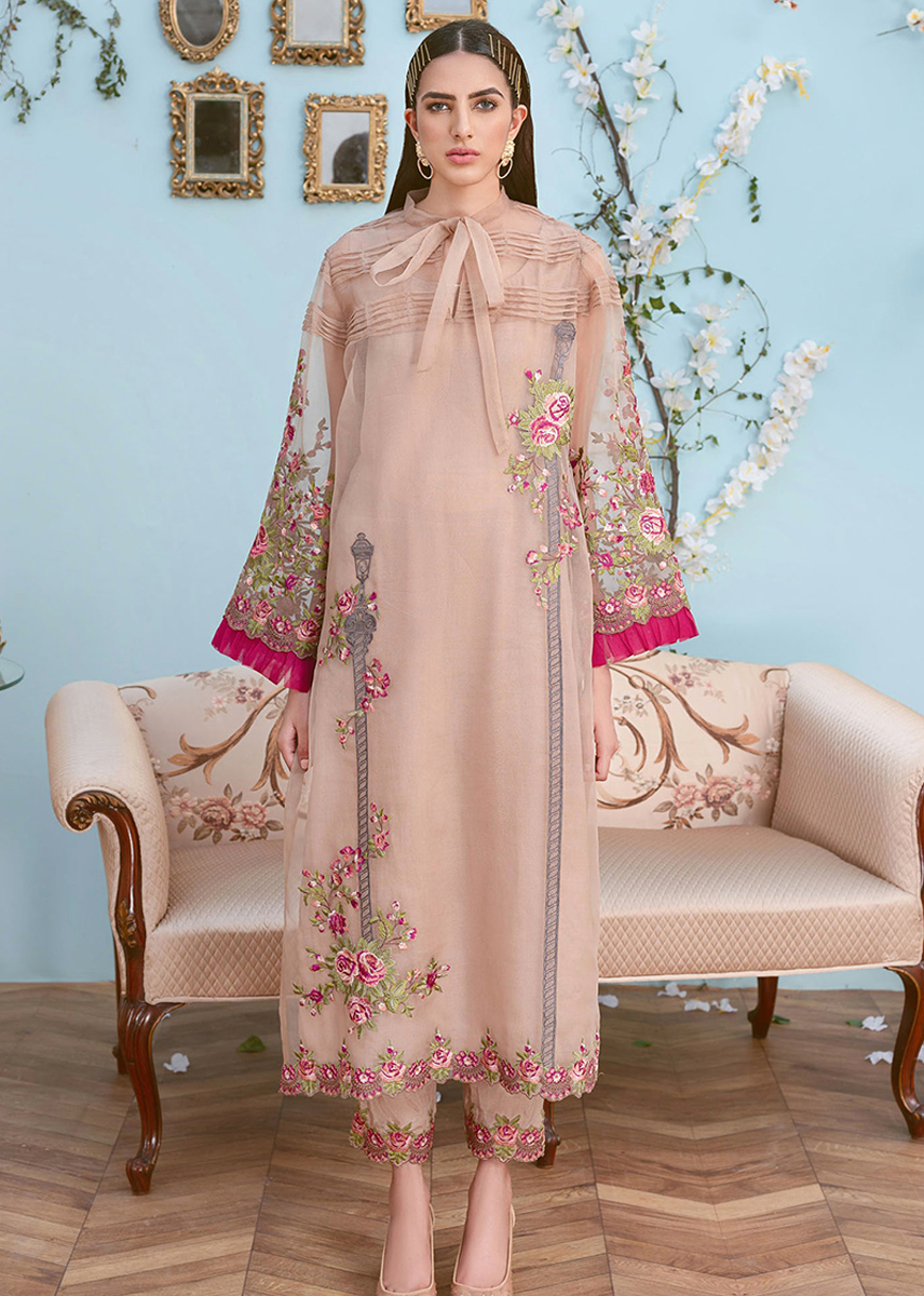 Lampdaire is an elegant French beige tone outfit that is designed with delicate embroidery in patterns of lampposts ,twinned with floral vine. Technique of pinched pleating and organza ribbon bow elevates the fashion quotient, finally locking the outfit with silk trousers with a rosy patterned hemline . This outfit gives a stylish twist with a French vibe to the traditional shirt and trouser ensemble.