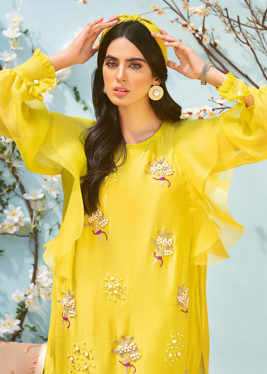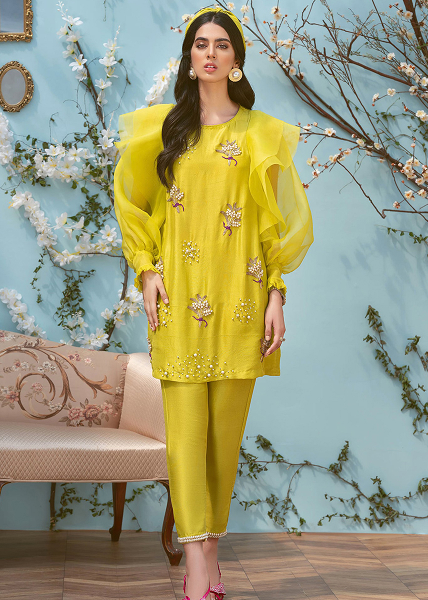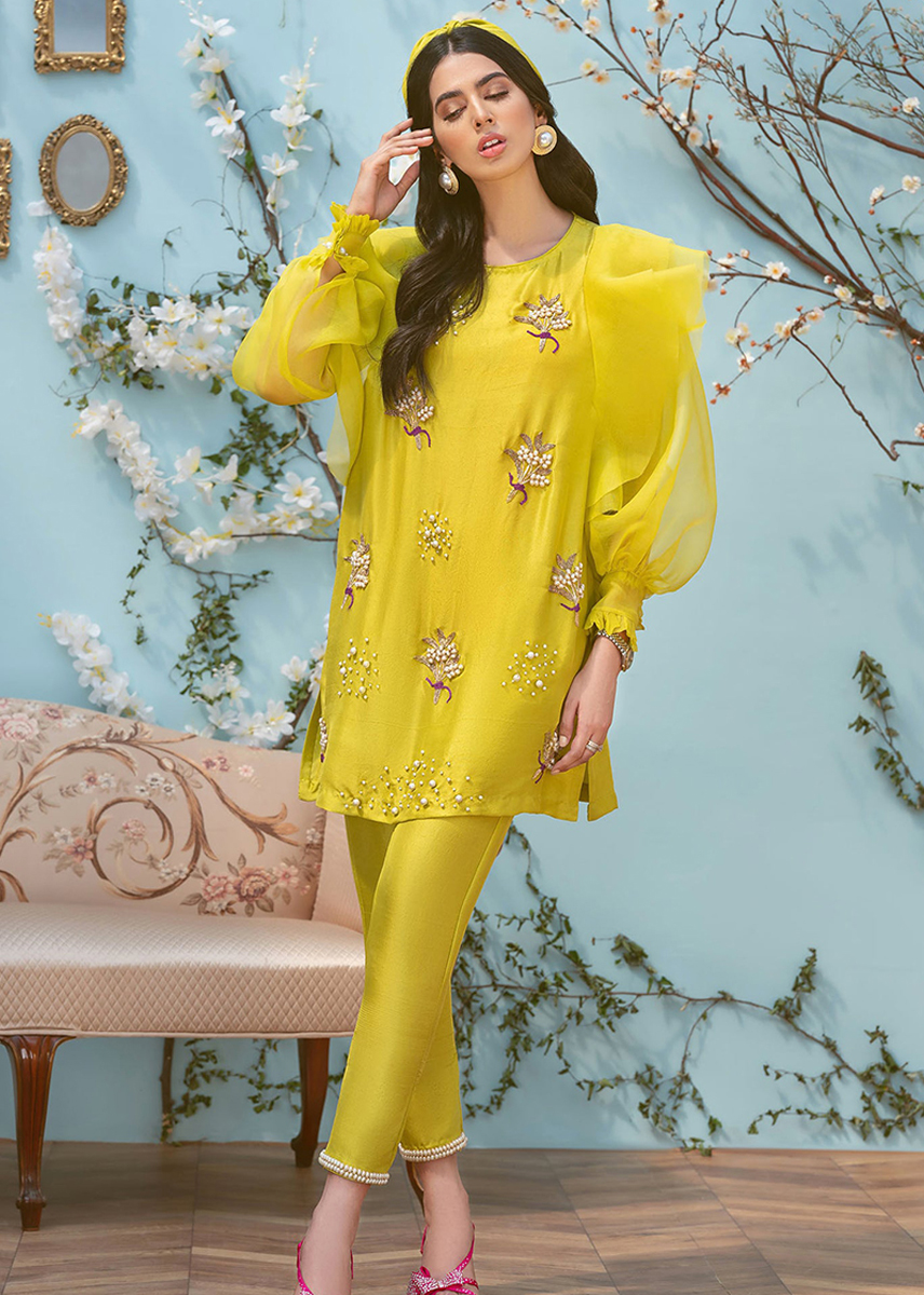 This fluorescent yellow outfit is stylishly curated from a combination of pure silk,sheer organza cascades with onion cuffed sleeves, to give a twist to the conventional shirt. The exquisitely embellished motives are fanned out on the shirt with rice pearls, dabka and thread knots. The outfit is completed with lean silk cigarette pants with pearl lines on the hem. This breathtaking ensemble ensures a fashion statement embodying the retro vibe.