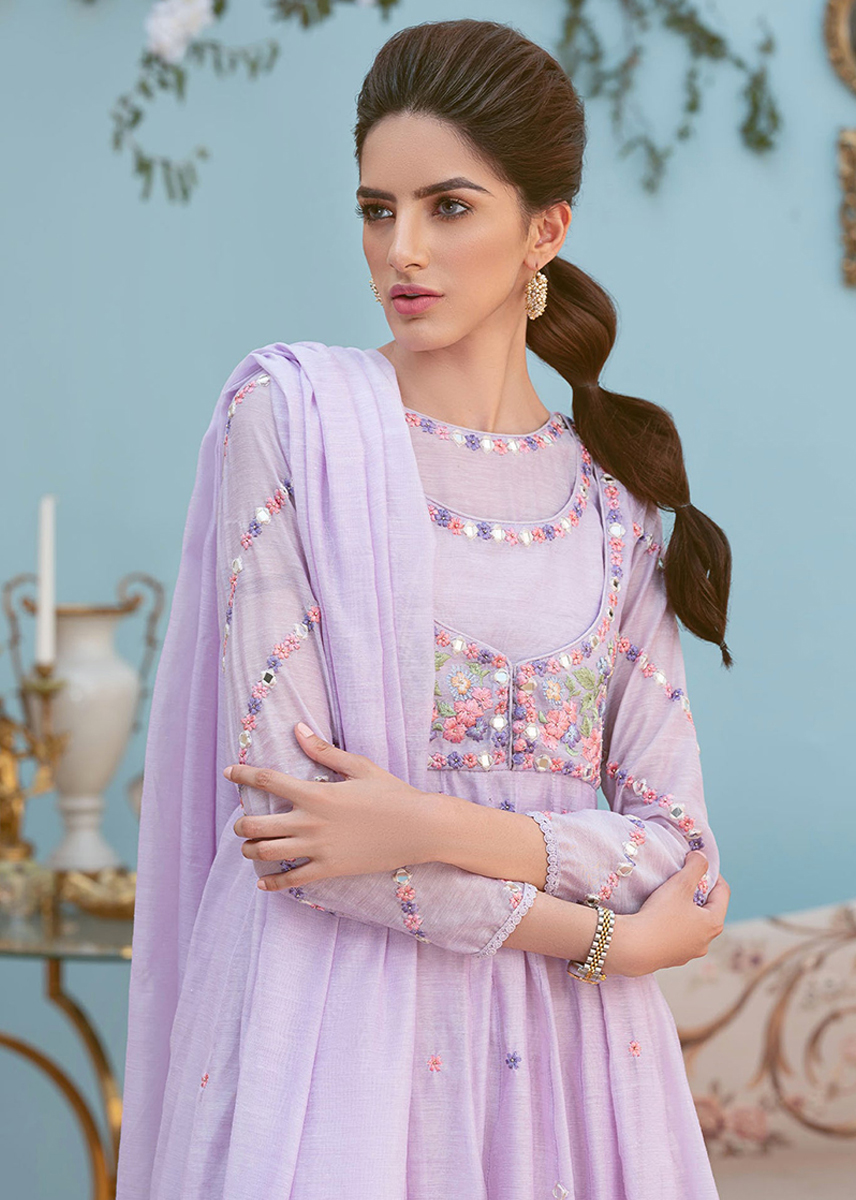 This beautiful watery shade of lilac is stitched into an elaborate yet simple kalidar in breathable paper cotton covered with intricate pastel thread and mirror work on the bodice and sleeves with spray all over. Self embroidery adorns the hemline of the kalidar and the dupatta elevates it's eastern flavor.
