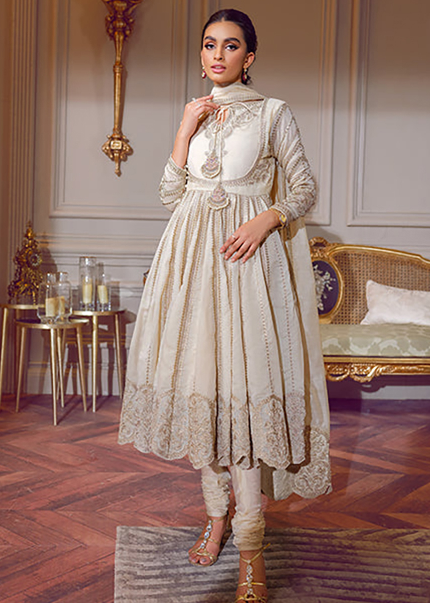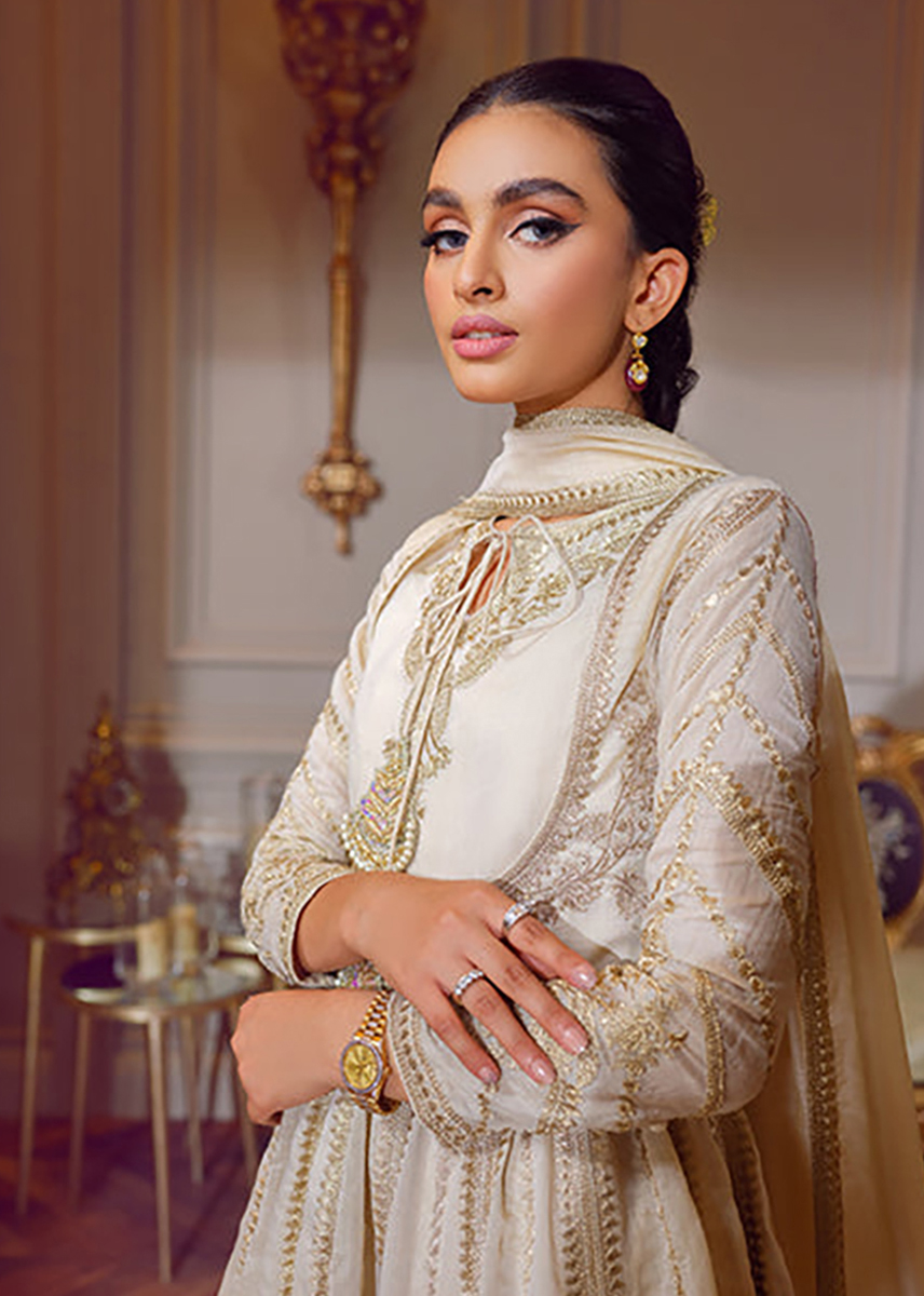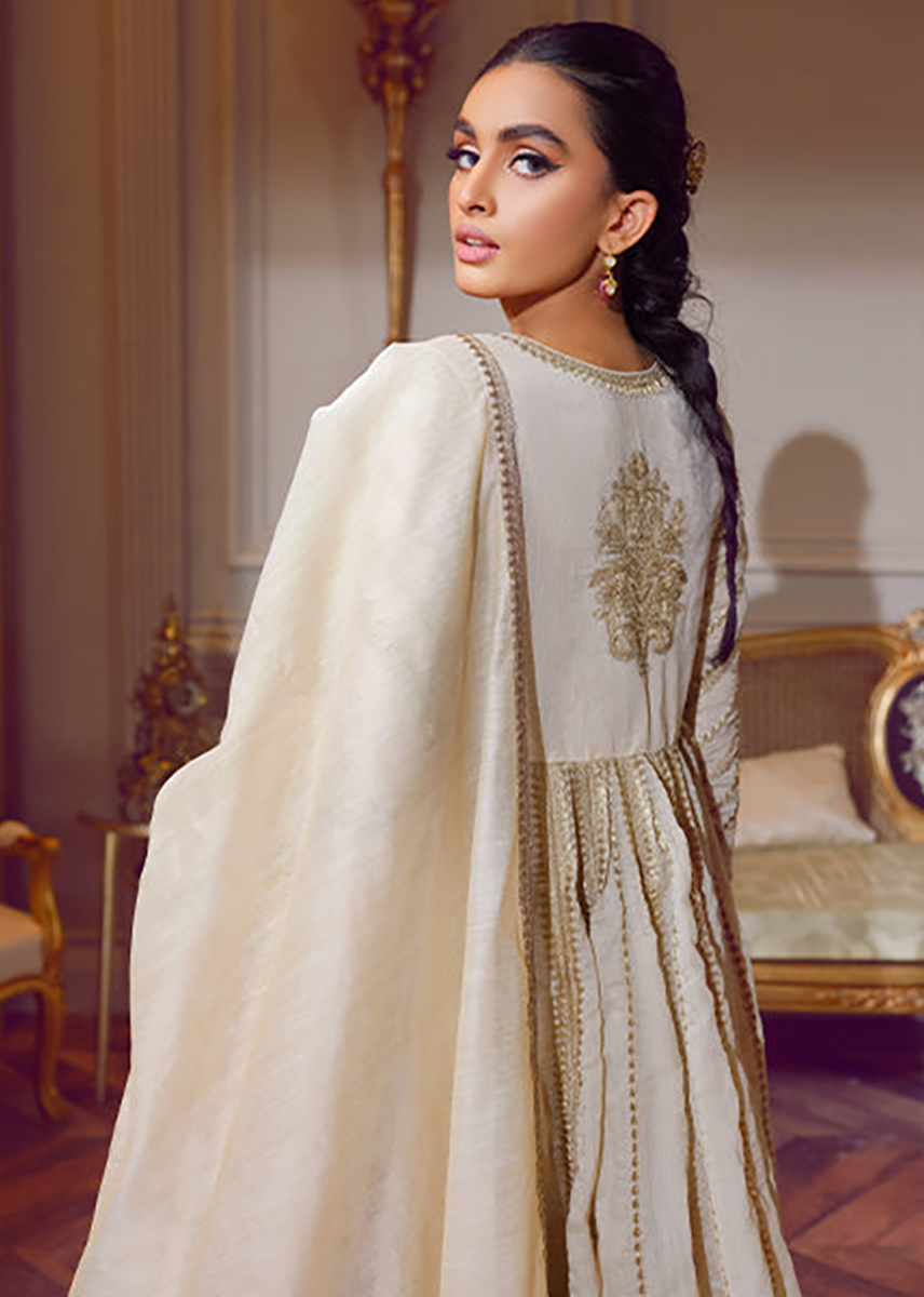 This 3 piece traditional pishwaas is crafted from an airy beige silk cotton. It is laiden with intricate patterns of pale gold tilla work, sprawled through the ghaira and palo of the dupaata. Completing the look with the classic choridar. The outfit qualifies a must have summer staple of festivities and celebration of eid and sorts.