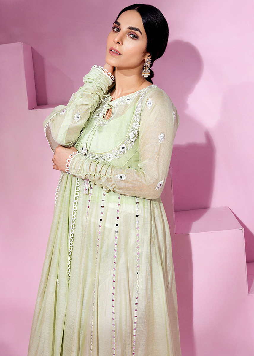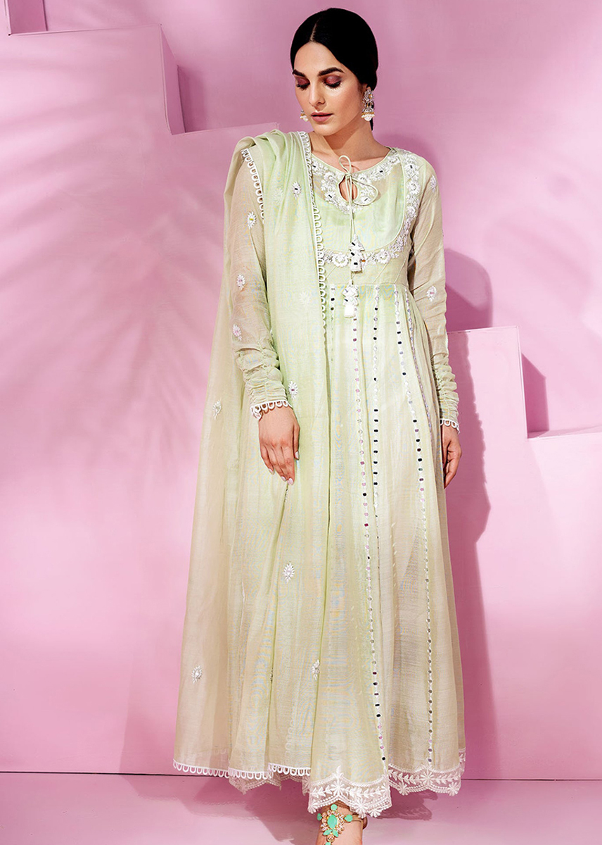 A-line pishwaas with mirror, thread work on panels lines and bodice on Egyptian cotton.