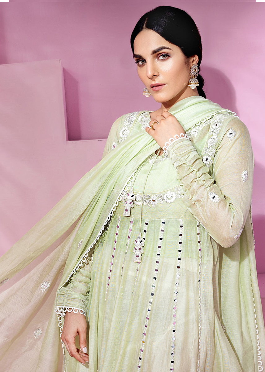 Shirt: A-line pishwaas with mirror, thread work on panels lines and bodice on Egyptian cotton. Accentuating white lace work on the edges.