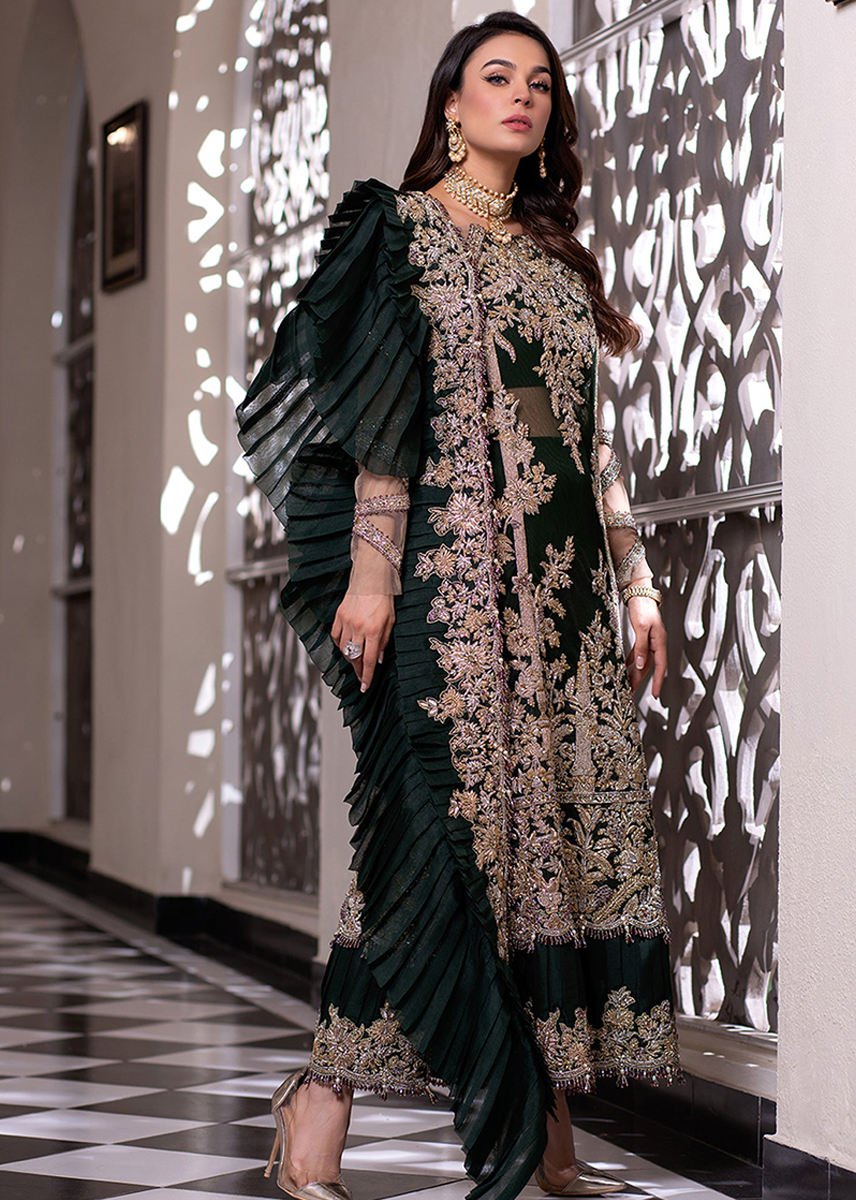 This Jade attire is a statement maker with pure net sleeves adorned with uniquely crafted handwork on the Foot Long shirt with heavy motifs on the fringe of Frill Dupatta.