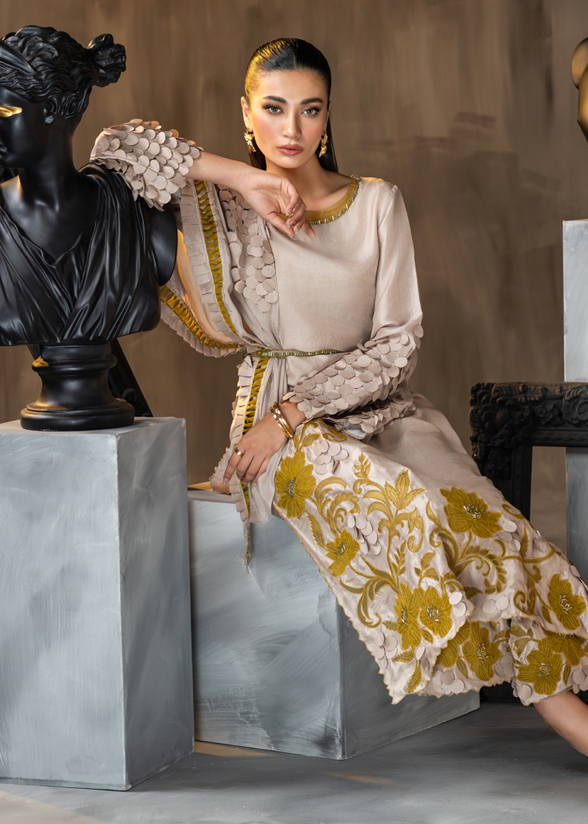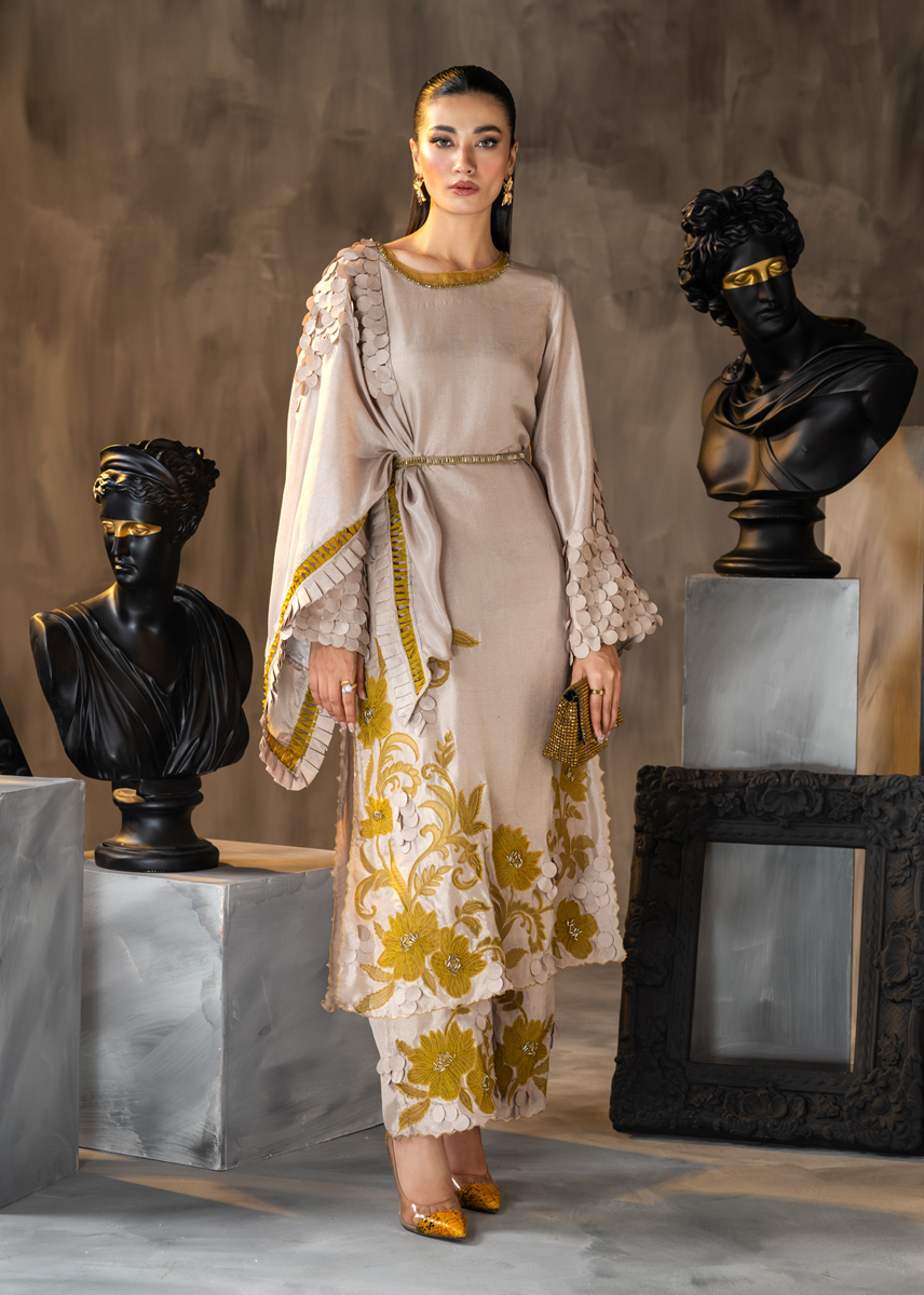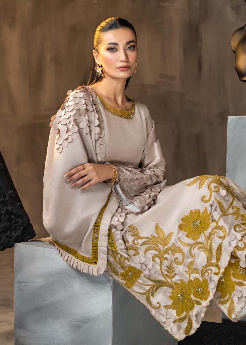 Celebrating the inner femininity, this Ash coloured straight raw silk shirt and palazzo pants is aesthetically embellished with mustard applique in floral patterns adorned with minimalistic crystals. The ensemble is further accentuated with techniques of fabric scales and fringes masterfully placed on the sleeves and the silk scarf. The look is sealed with a delicate hand encrusted crystal belt. Moon Lilly, hued in pale tones, sure knows how to make a fashion statement.