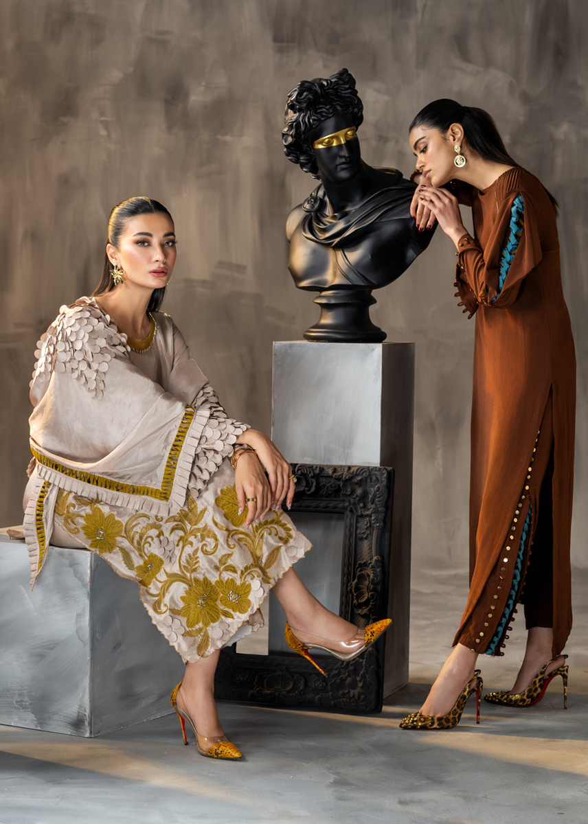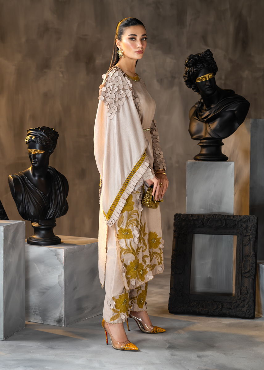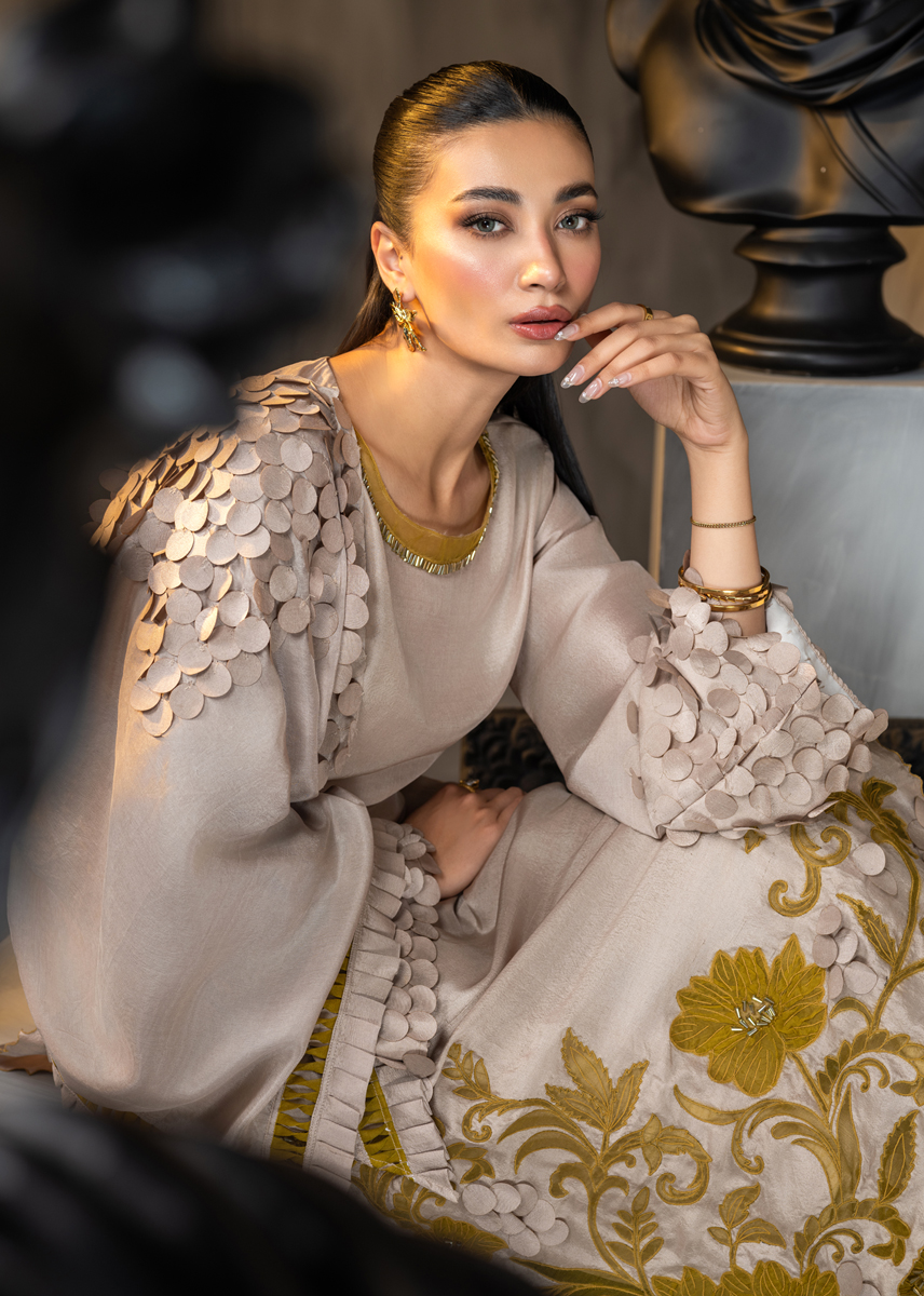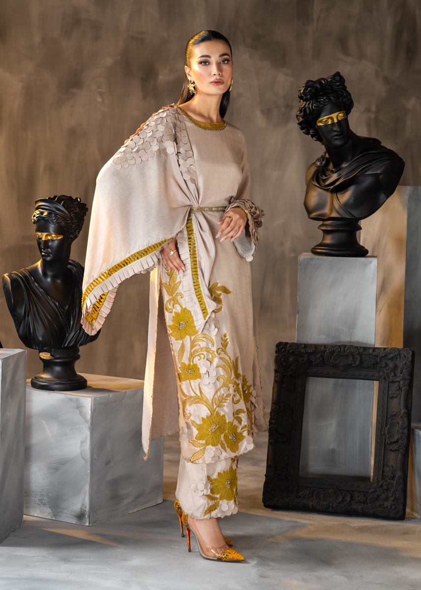 Celebrating the inner femininity, this Ash coloured straight raw silk shirt and palazzo pants is aesthetically embellished with mustard applique in floral patterns adorned with minimalistic crystals. The ensemble is further accentuated with techniques of fabric scales and fringes masterfully placed on the sleeves and the silk scarf. The look is sealed with a delicate hand encrusted crystal belt. Moon Lilly, hued in pale tones, sure knows how to make a fashion statement.