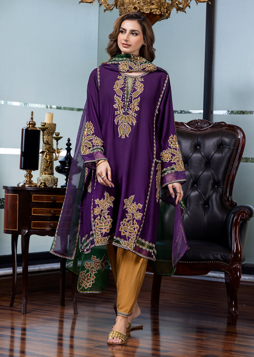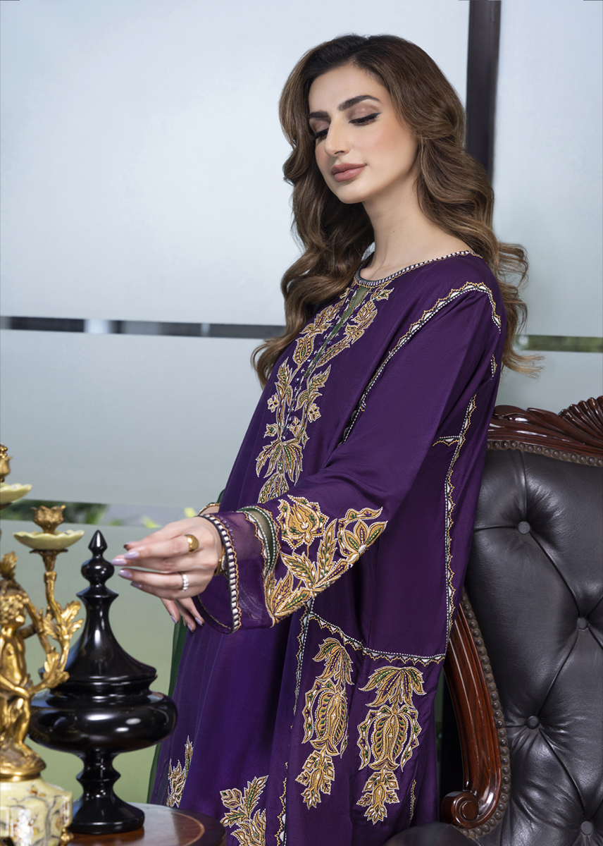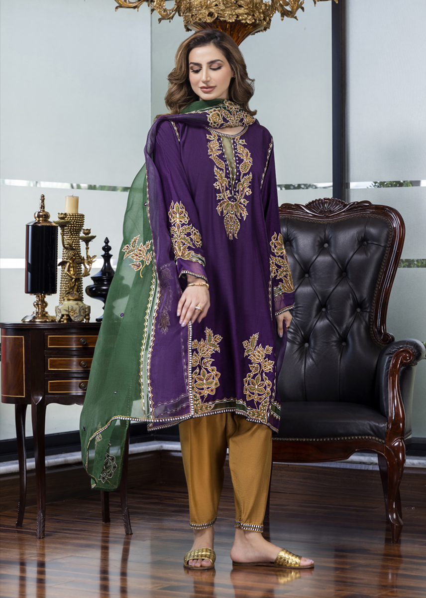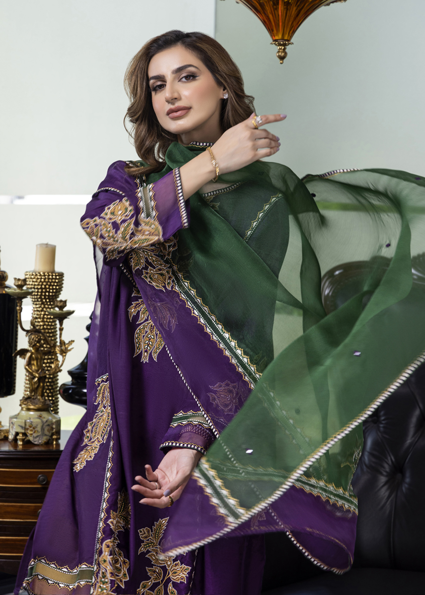 Mystique embodies pristine elegance amalgamating cultural elements with a stylized aura. The deep aubergine silk kurta is aesthetically laden with a combination of floral motives developed with work of appliqué and embroidery. The stark contrast shalwar and dupatta both with detailing seal the look for modern woman who owns her roots embedded in tradition.