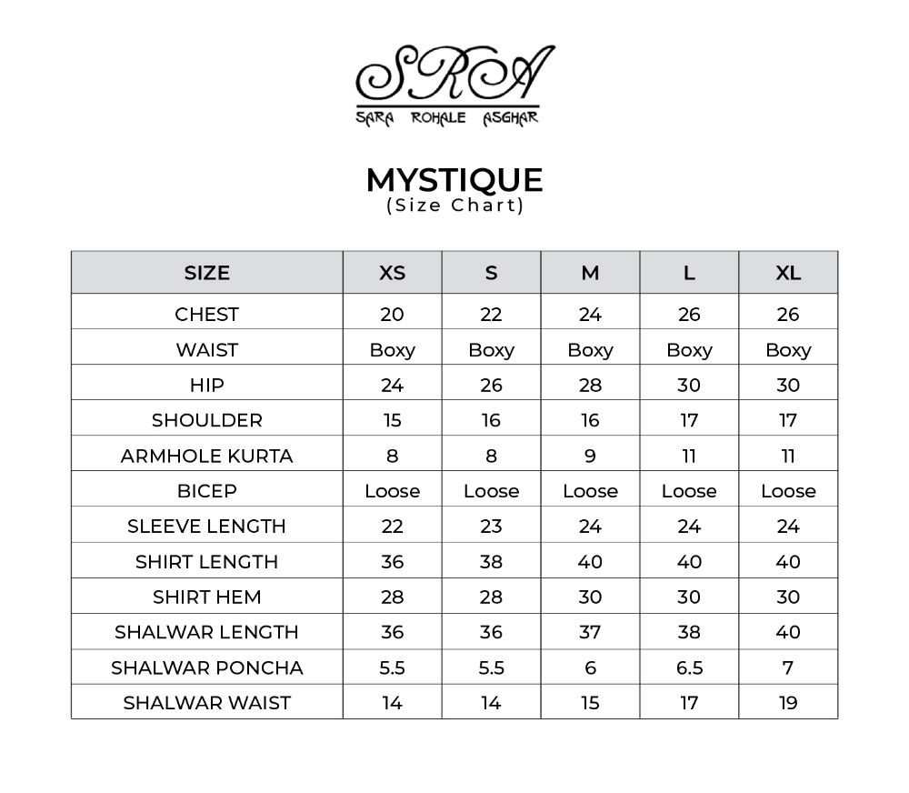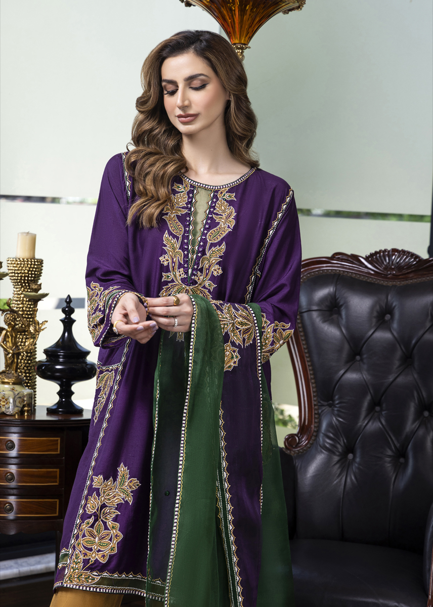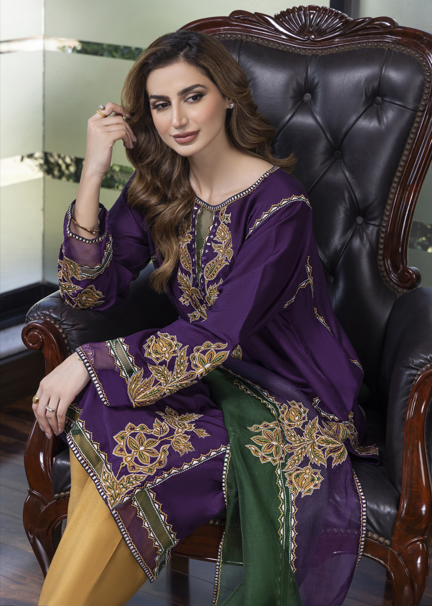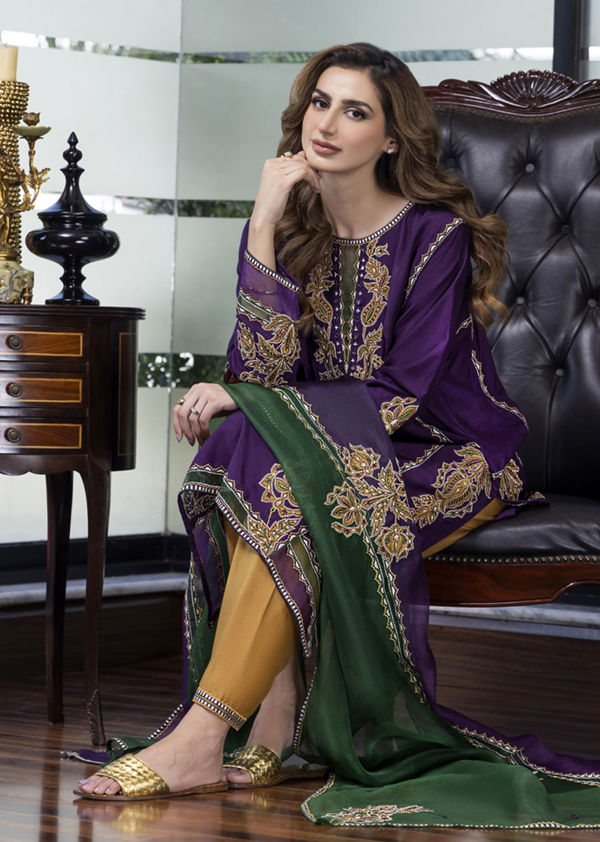 Mystique embodies pristine elegance amalgamating cultural elements with a stylized aura. The deep aubergine silk kurta is aesthetically laden with a combination of floral motives developed with work of appliqué and embroidery. The stark contrast shalwar and dupatta both with detailing seal the look for modern woman who owns her roots embedded in tradition.