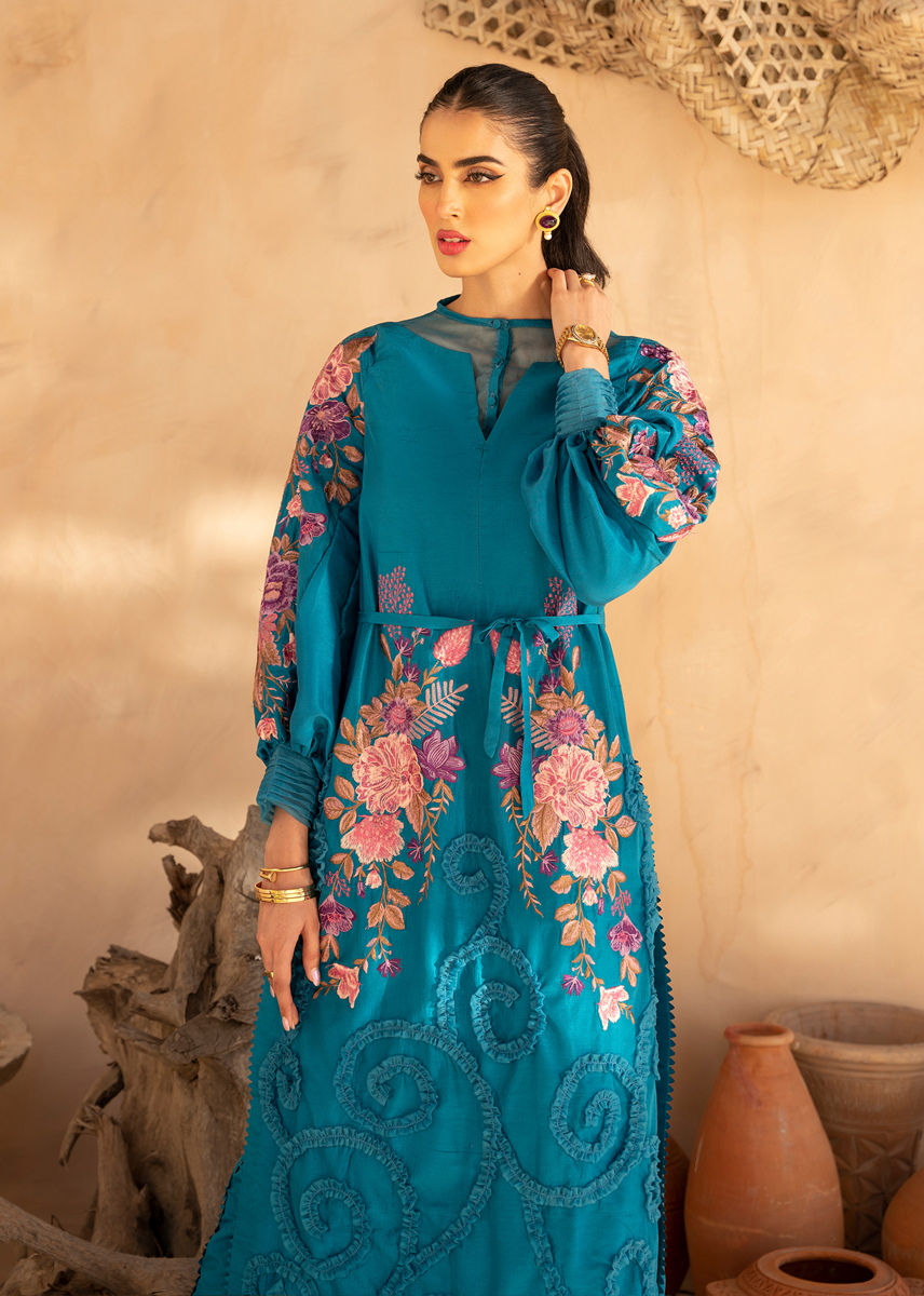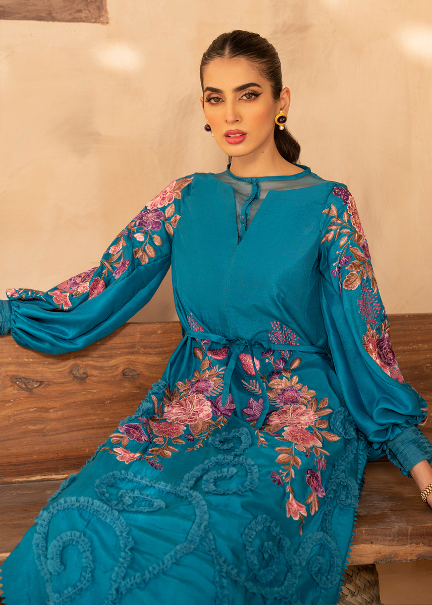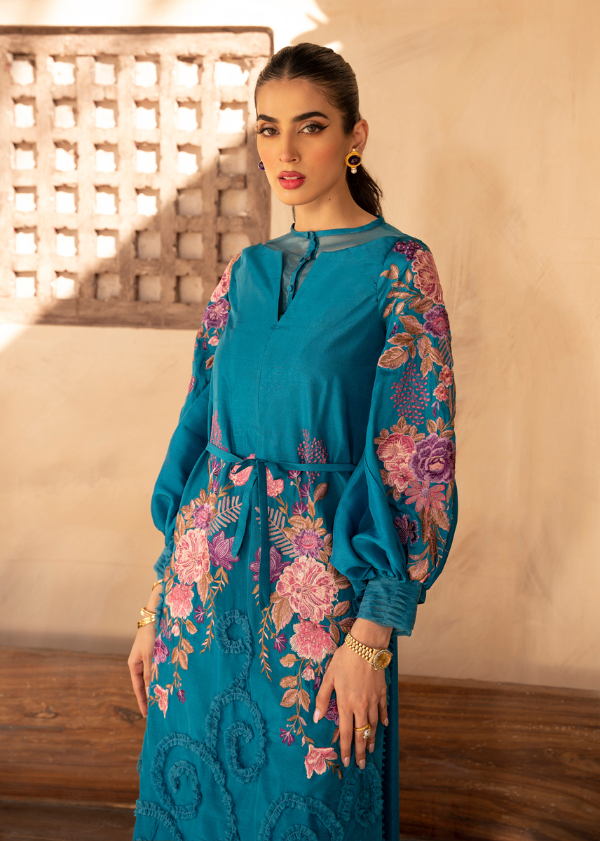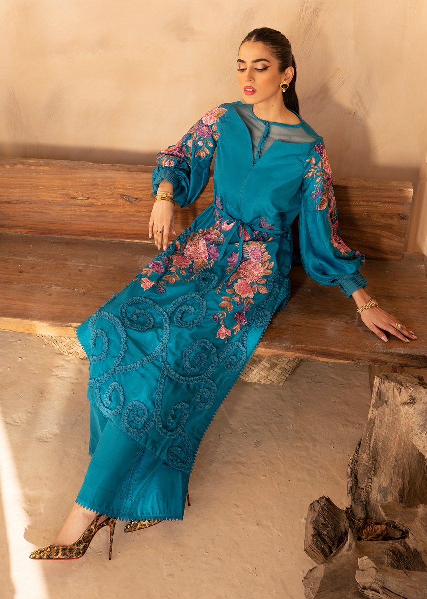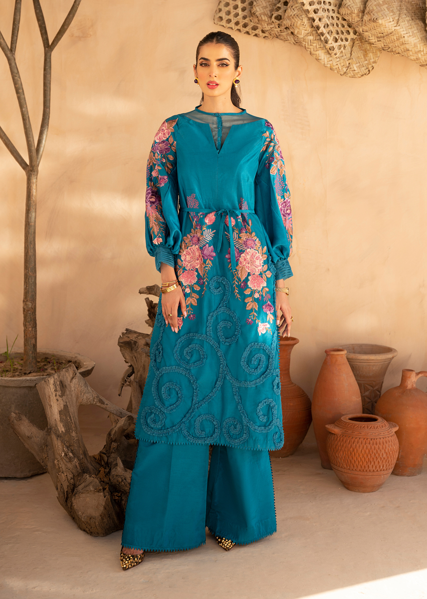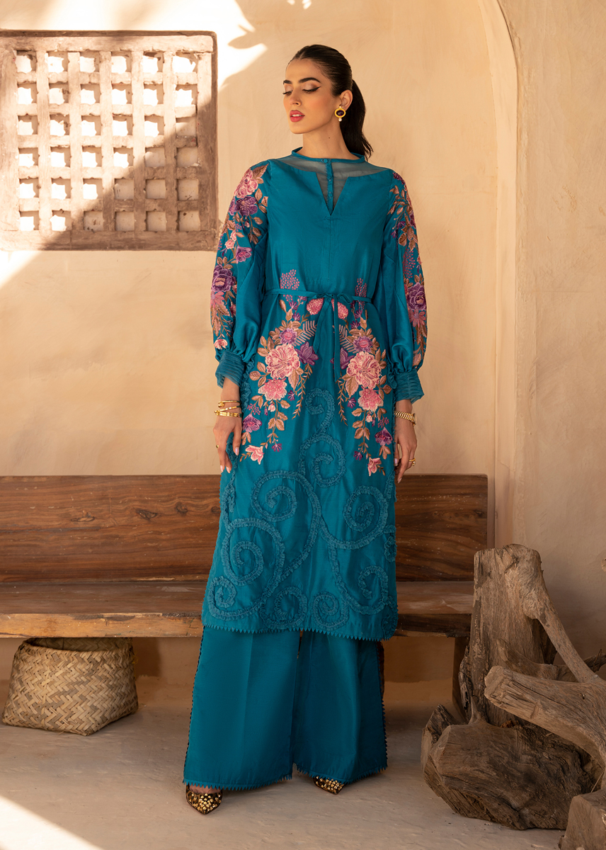 This contemporary two piece ensemble couples tradition with a modern silhouette, exuding essence of sophistication and festivity. The pure raw silk shirt drenched in a fusion of teal and turquoise background adorned with bold floral motives on the shirt and flared sleeves. Skilled artisans meticulously curate elements of fabric scrolling and cut work fringes running on the daaman and edging of the shirt and pants.