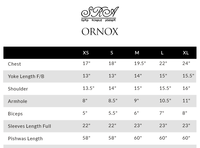 Ornox is masterfully crafted to evoke a sense of mystique and regality. Masked in ebony silk, this ethereal payshwaas is brought to life with intricate gold foil prints, shimmering like a constellation of fallen stars scattered across on an obsidian sky. The elongated panels, laden with opulent gold motifs, cascade down in an unbroken flow of luxury and precision, each print exuding an air of ornamental brilliance. The sheer mastery of the gold foil application allows the fabric to flicker and gleam with an almost supernatural luster, transforming movement into an artistic expression. The sheesha embellished yoke glistens like shattered stardust, with each reflective mirror meticulously placed to capture and refract light with delicate tassel crafted from a harmonious blend of silk threads, metallic accents, and intricate mirrorwork, ensuring that they catch the light with every graceful motion. The voluminous silhouette, infused with grandeur, makes each step a performance dramatic, effortless, and resplendent. Ornox is an affair with the night, a poetic dance between light and darkness.