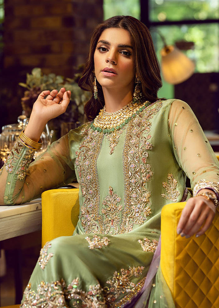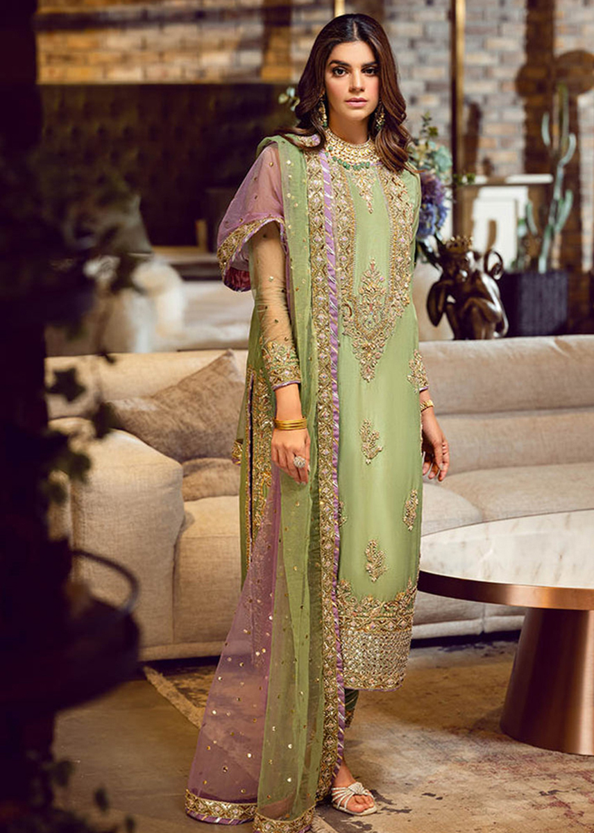 This breathtaking combination of pista green and lavender amalgamates in a unique way making it a must have outfit. To enhance the style quotient artistic embellishments are sprawled throughout the shirt and net dupatta. The look is completed with gotta work on the pantgiving it a timeless vibe.