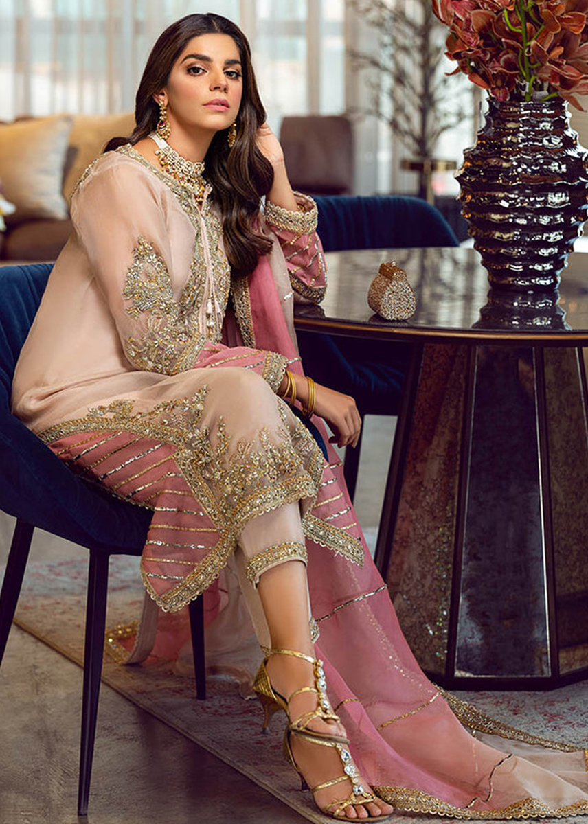 A classic long shirt adorned with sparking beads, zardozi and mukesh sewed in patterns and motives laden aestbically over the sorbet peach shirt and pants. It is accentuated with rose pink panels and duppata lined with Mukesh completing the ethereal look.