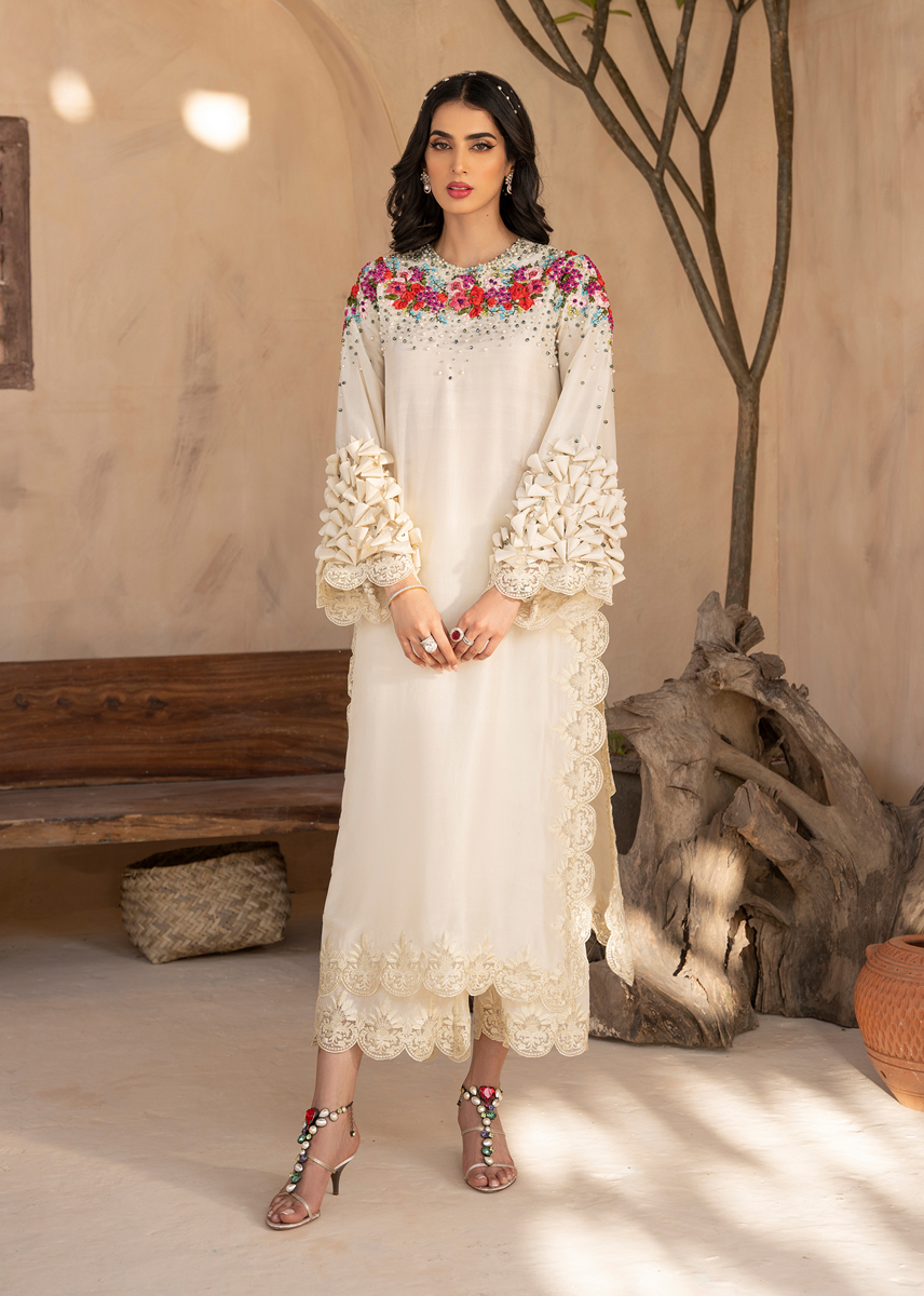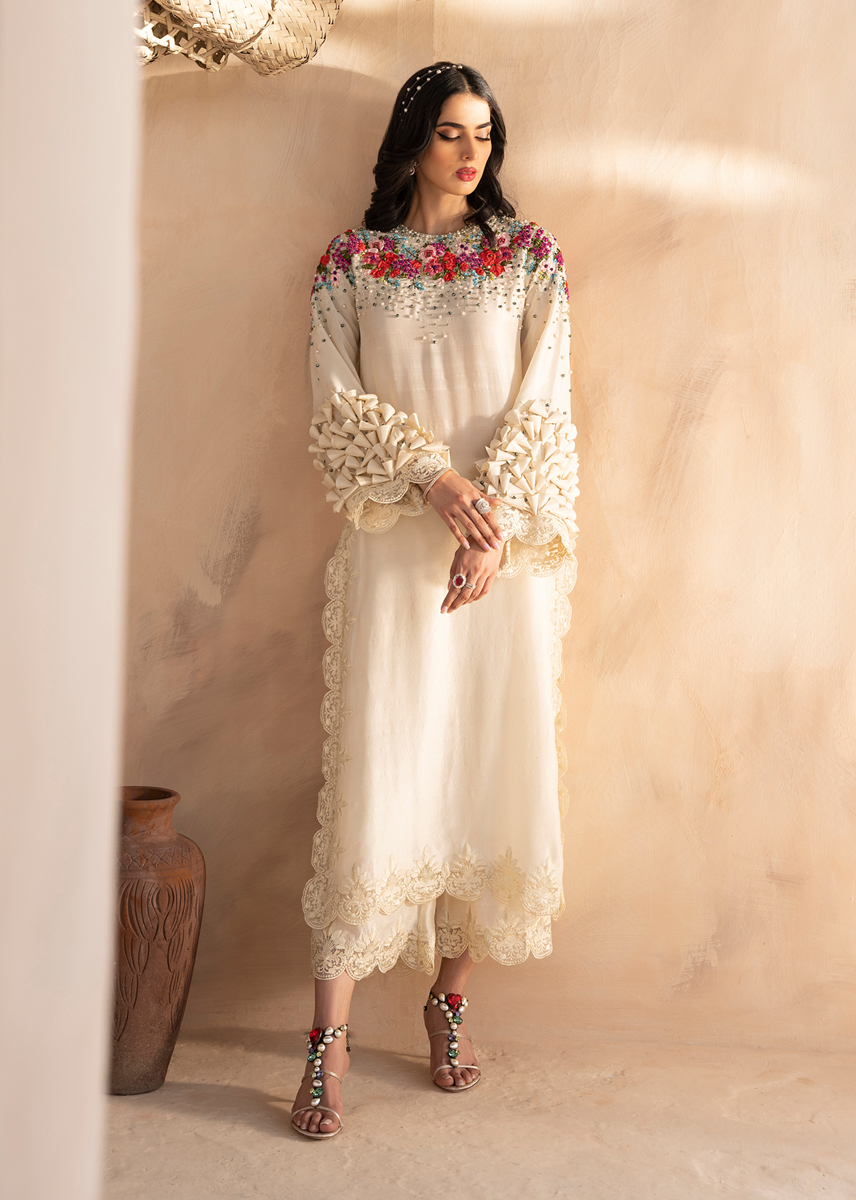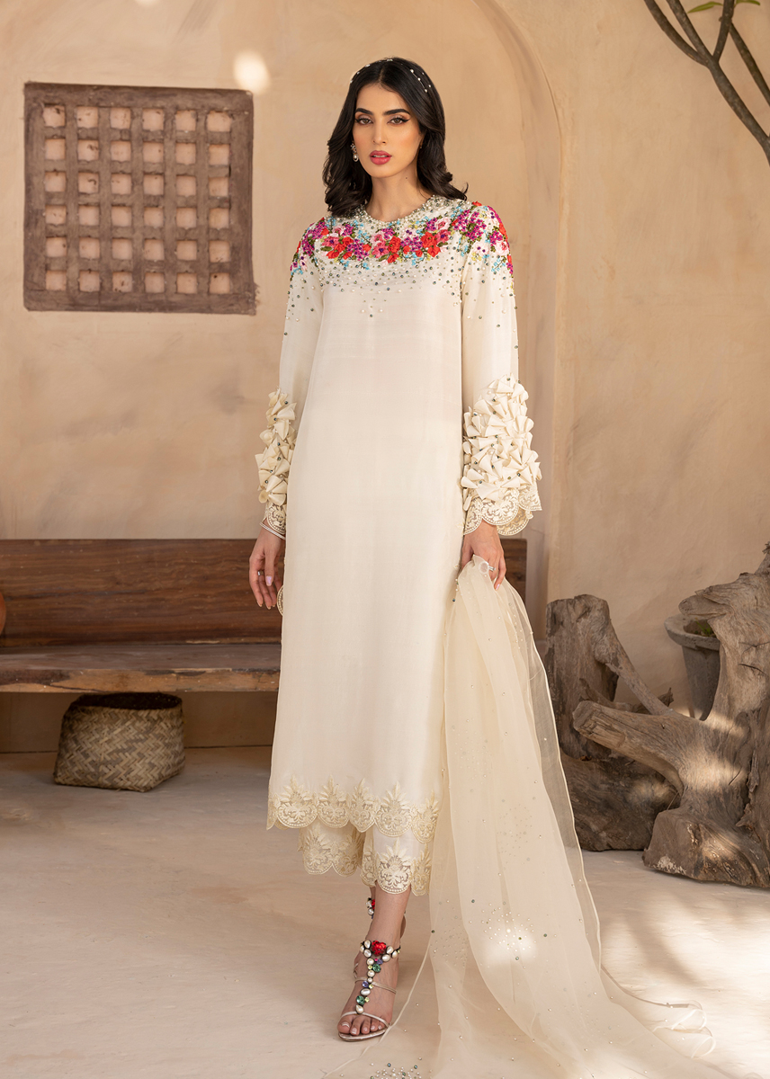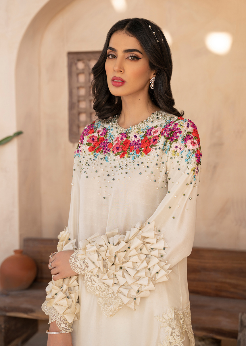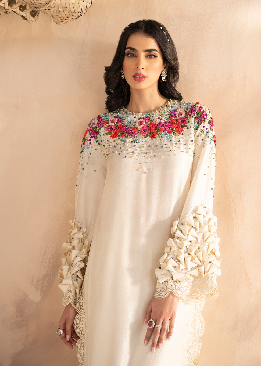 The stylish outfit is a vision of craftsmenship and aesthetics. The statement long pure raw silk shirt is decorated with ribbon work in floral patterns running through the neckline and sleeves sprawled with crystals and pearls. Exquisite fabric origami is placed on the sleeves. The shirt and trousers are completed with monotone embroidery. The outfit is sealed with an organza dupatta with a spray of crystals and pearls.
