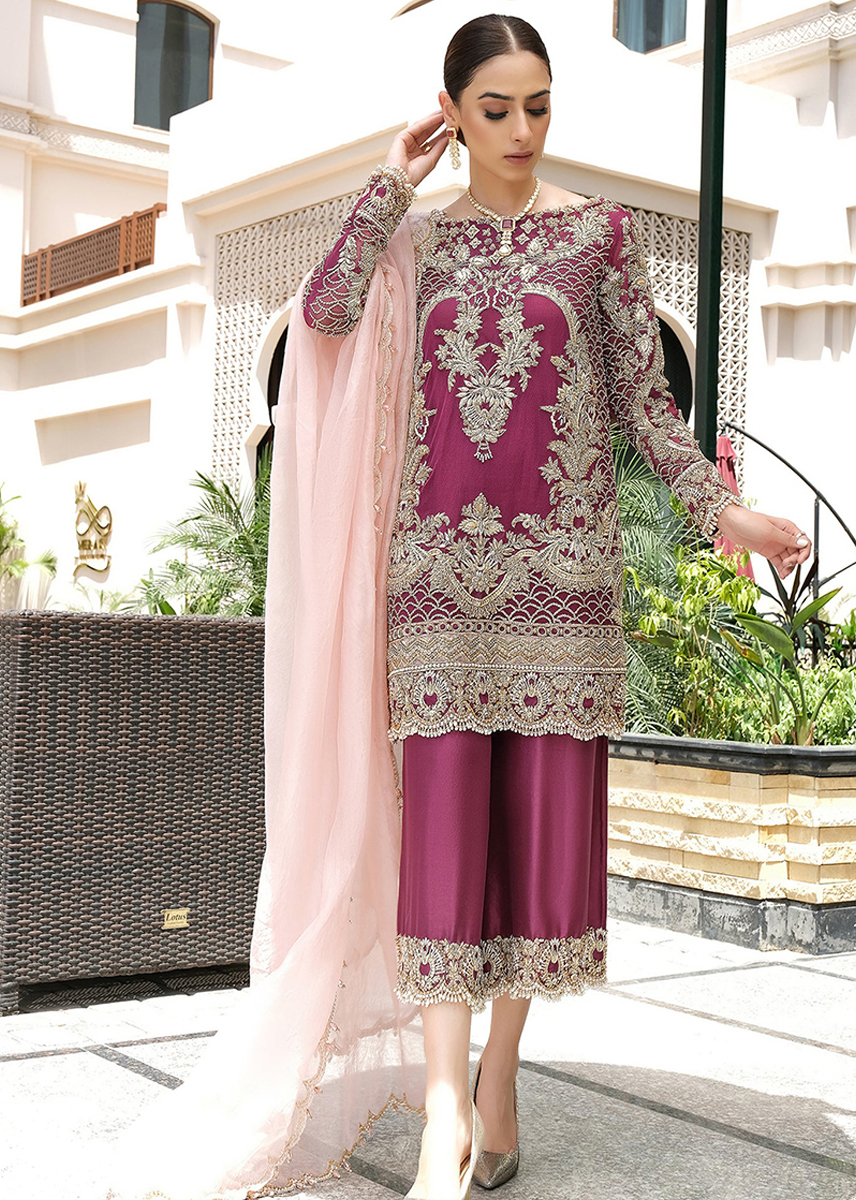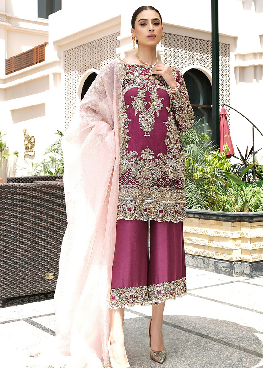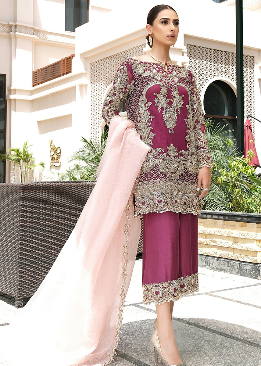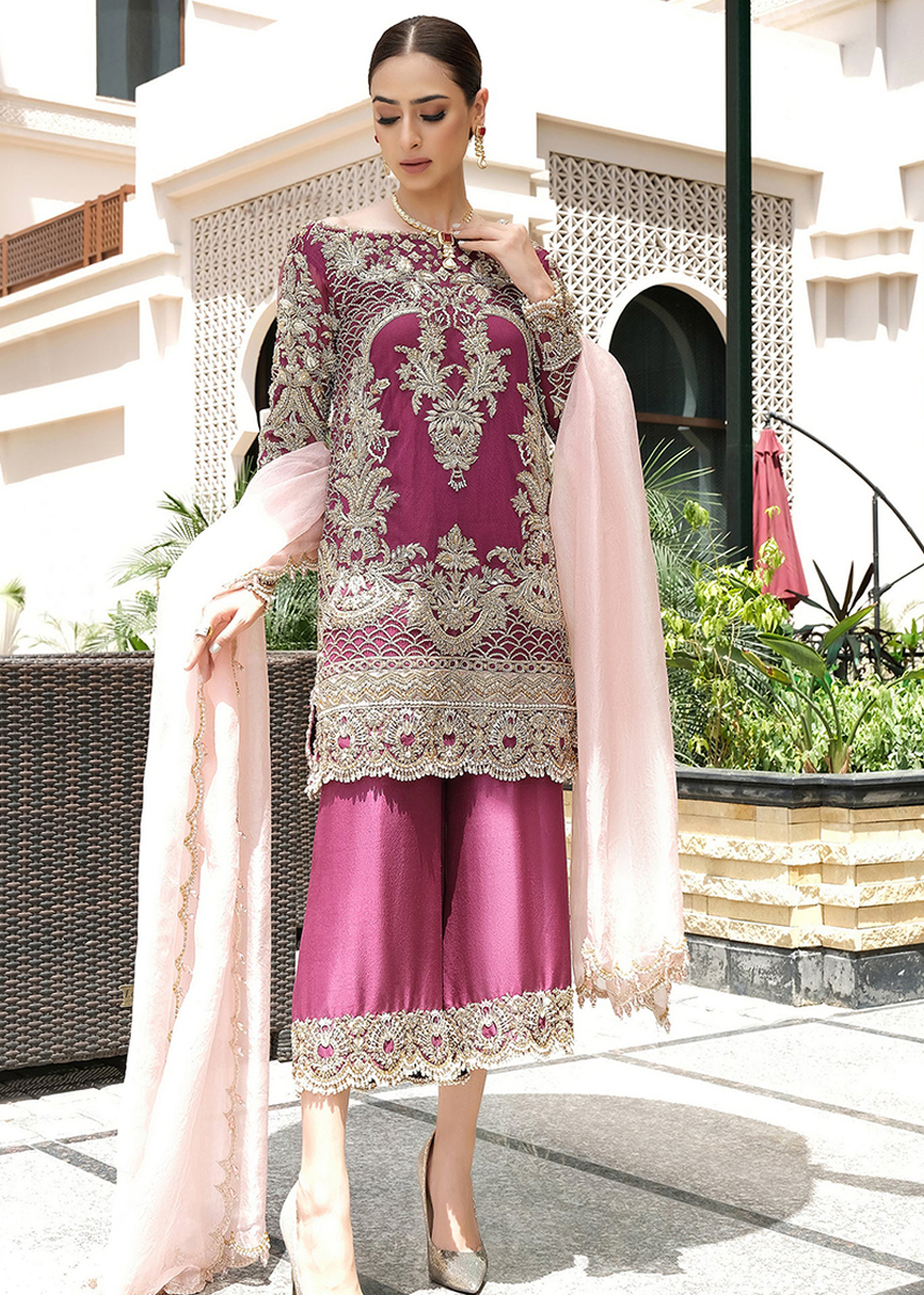 An ensemble that creates a picture of rich tradition and class, featuring vivid hues of red highlighted with intricate resham embellishments.