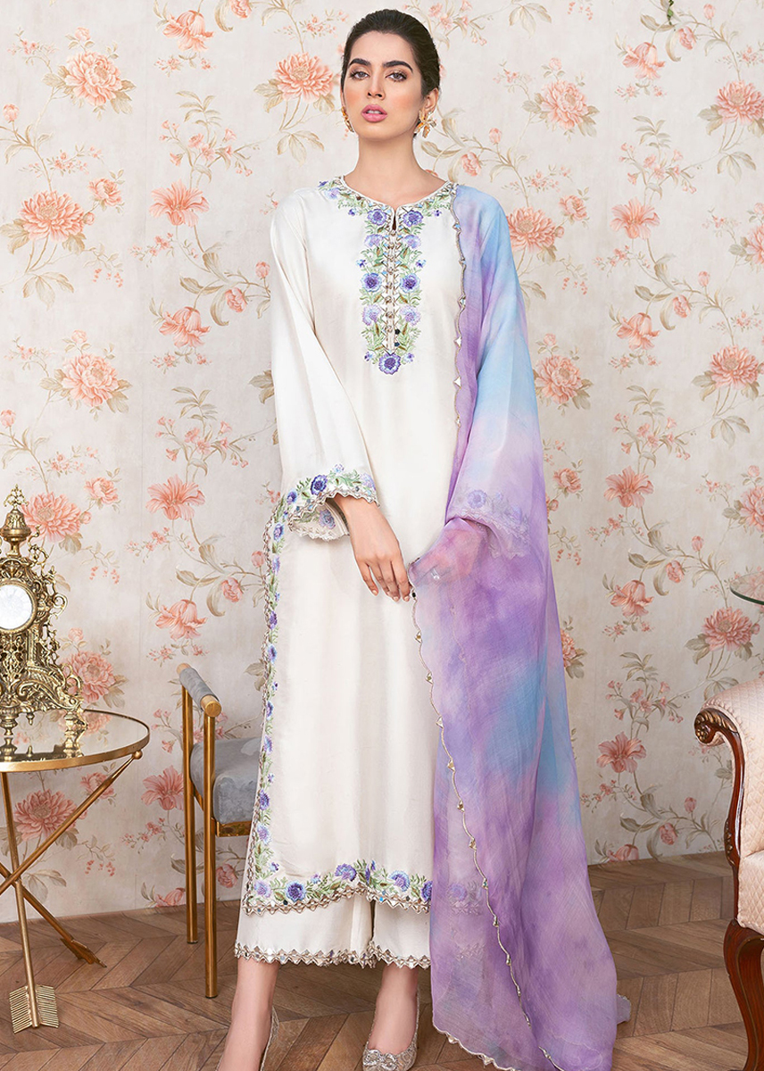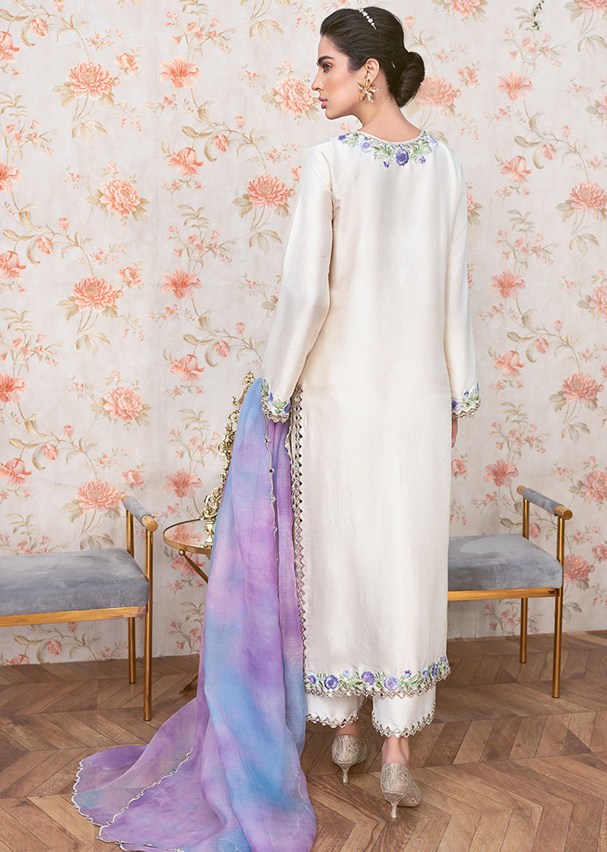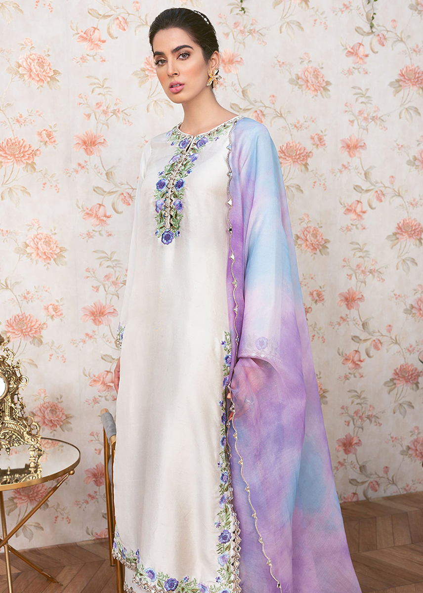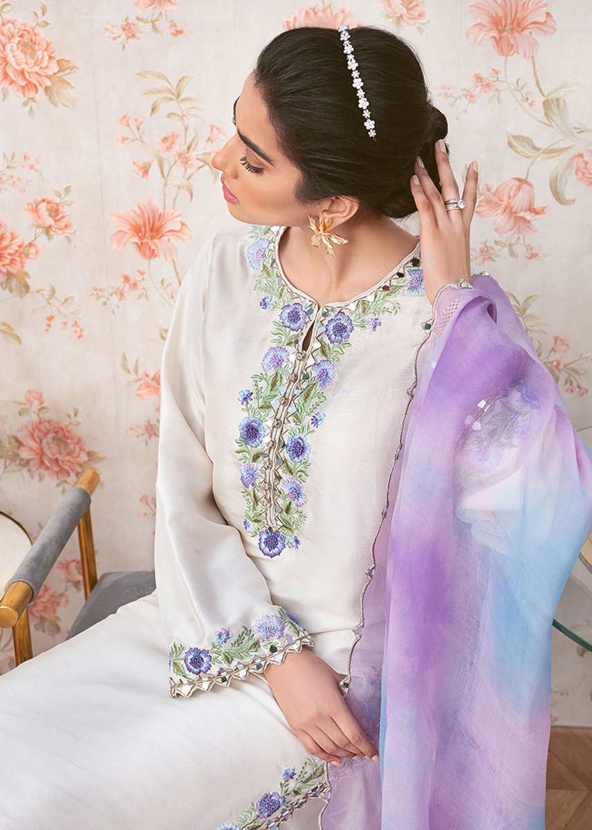 Skylit gold is a perfect pearly white, pure silk, long shirt which is embellished with flower vines edged with marakesh mirrors and tilla threads.