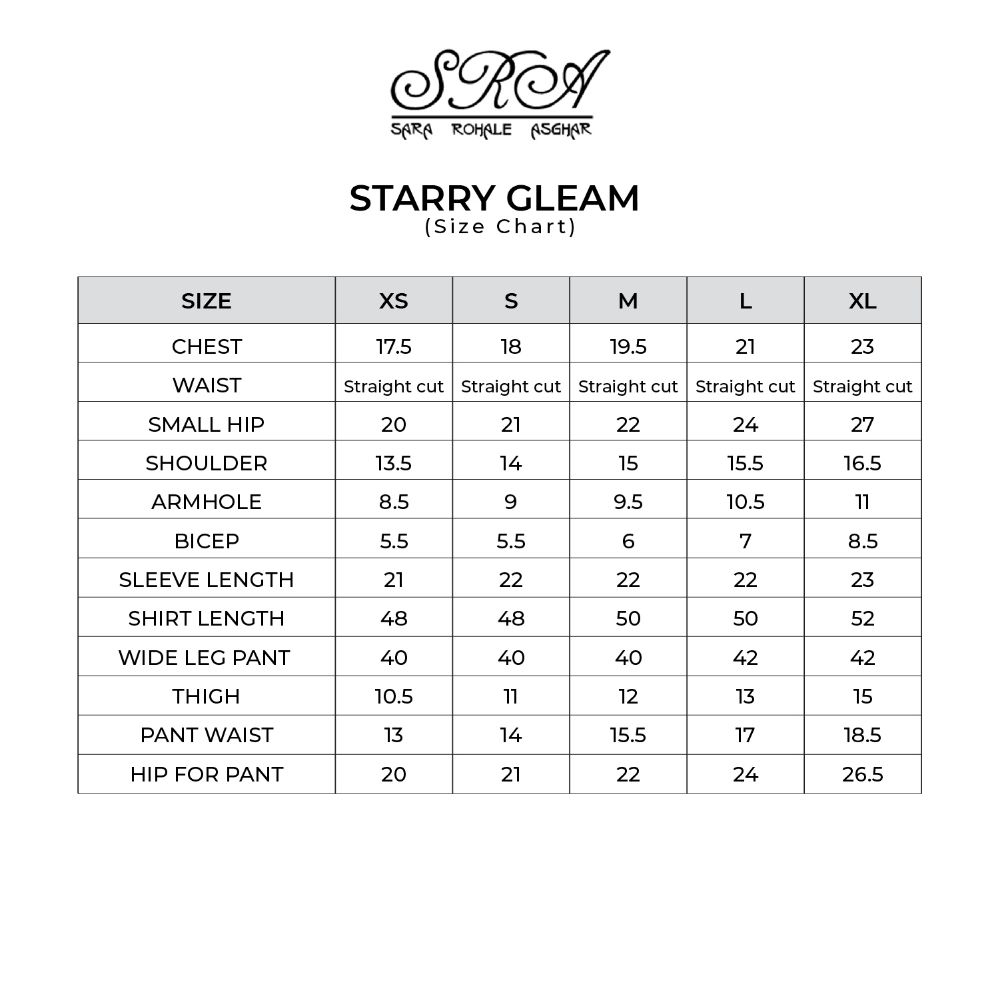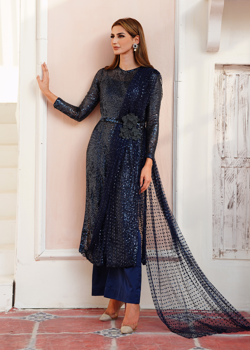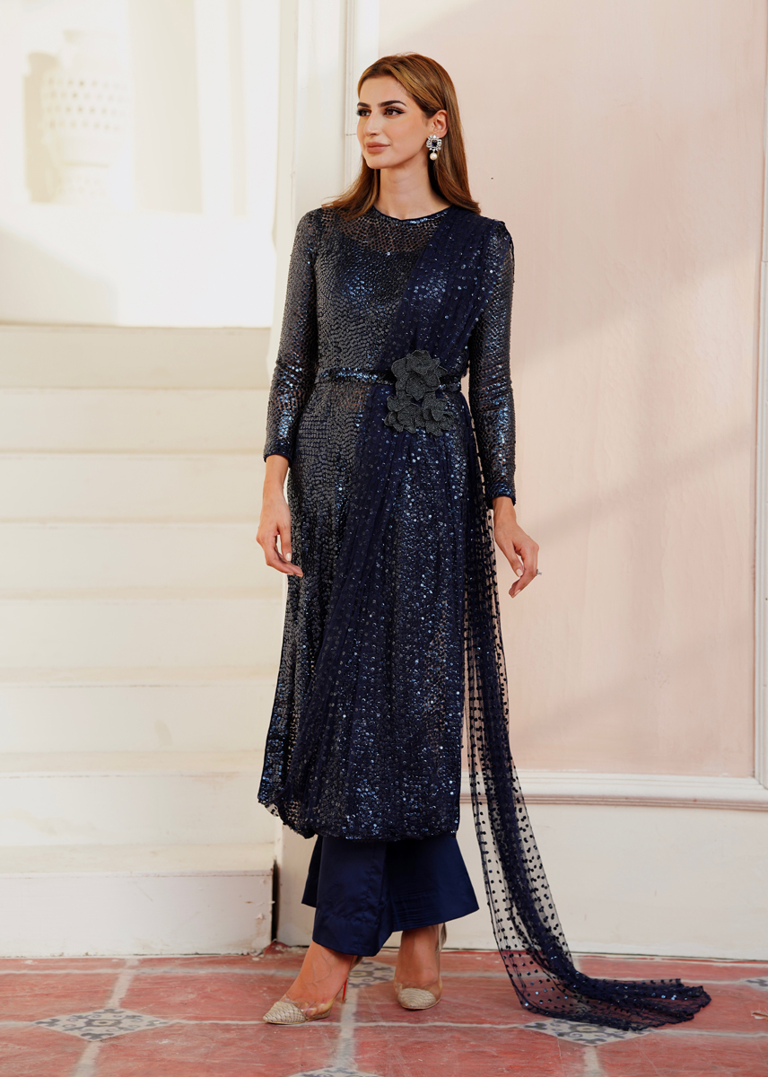 Net shirt sprawled with hand laiden sequins resemble the gleam of a starry night, an attached dupatta with the shirt draped over the shoulder gives it a sleek and alluring look and the hand curated flower motives sitting on the waist belt hold the ensemble together. The glamorous outfit is completed with silk pants making it an apt choice for special occasions for a bold fashion statement.