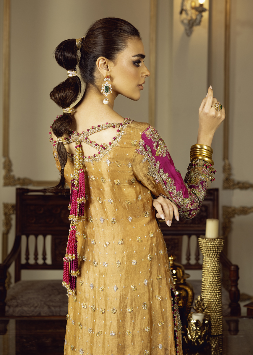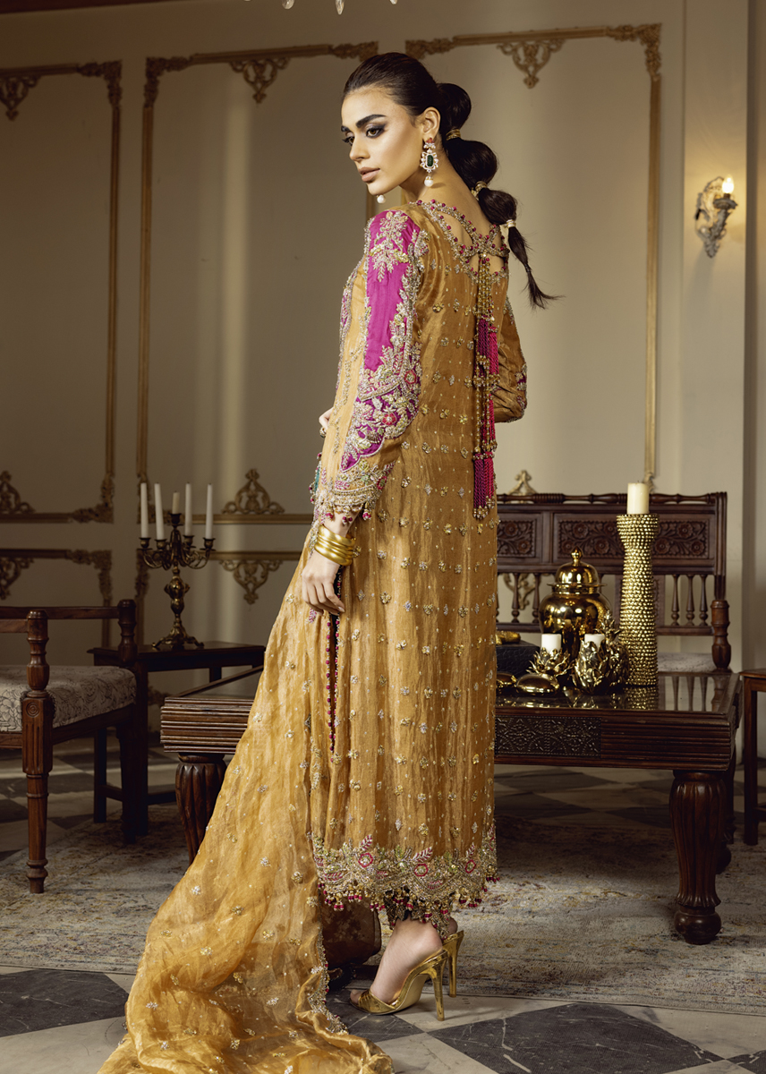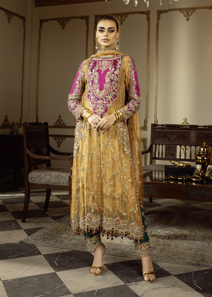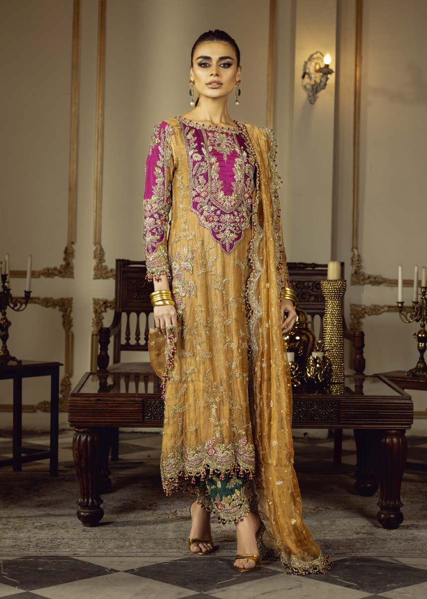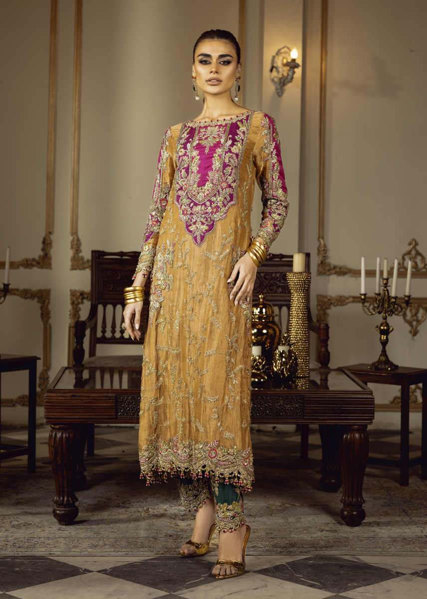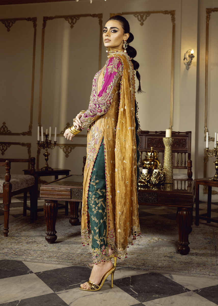 In the dimly lit room, SULTANIQUE emerges like a spectral bloom created with pure tissue in pale tangerine tone adorned with ethereal floral motifs paying homage to tales of ancient traditions. The ensemble celebrates old school elegance with each taanka laden carefully on the eclectic appliques creating a myriad of colors amalgamating convention with modernity. The turquoise green raw silk pants break the monotone of color and fabric exuding festivity and a mood of color and happiness.