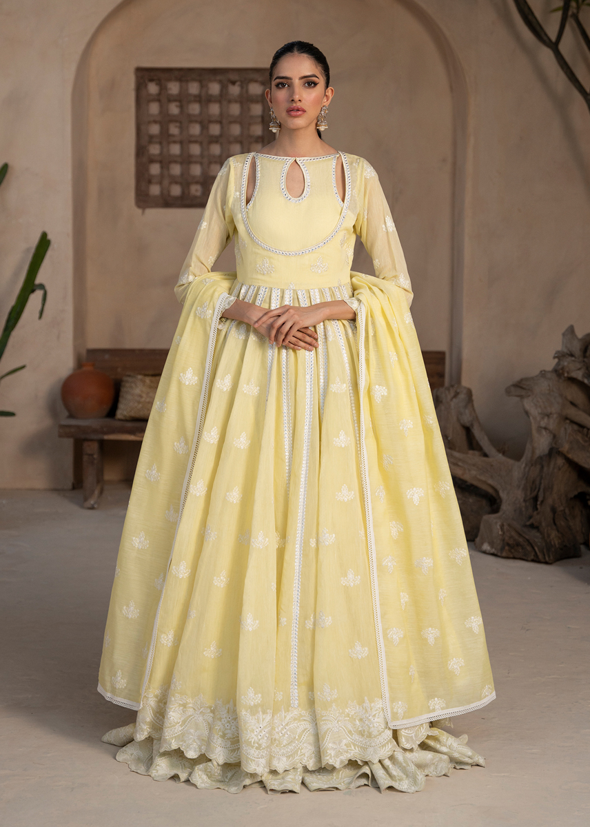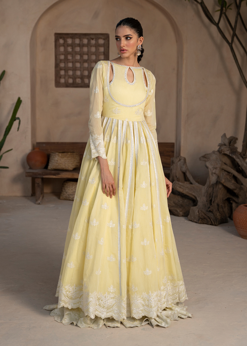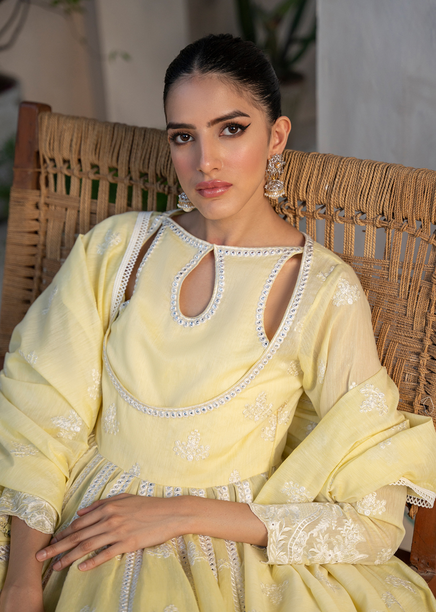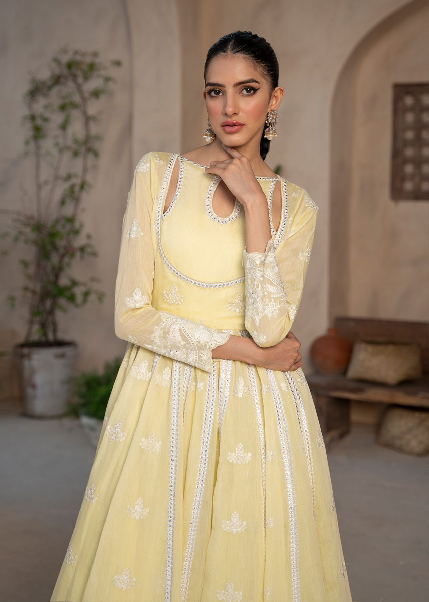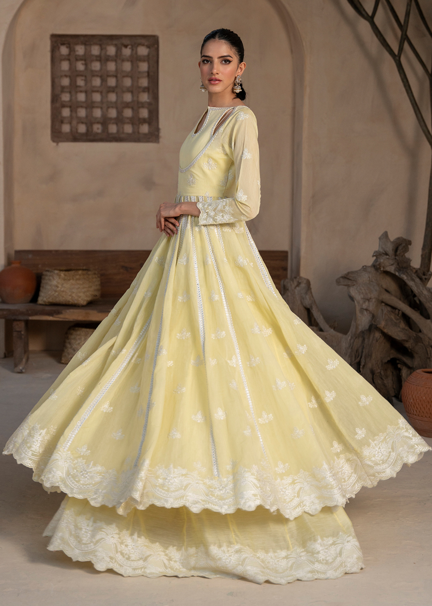 A radiant and resplendent lemon coloured double A-line pishwaas capturing the essence of joy and celebration during Eid festivities.