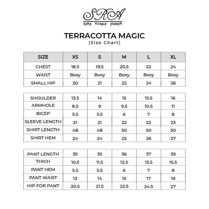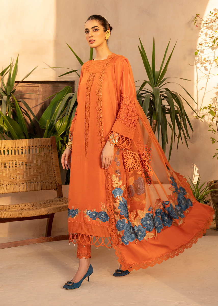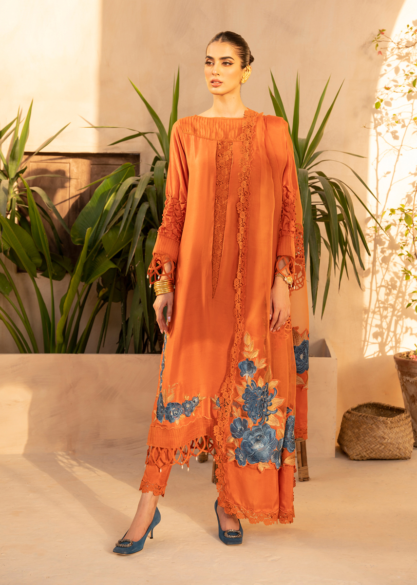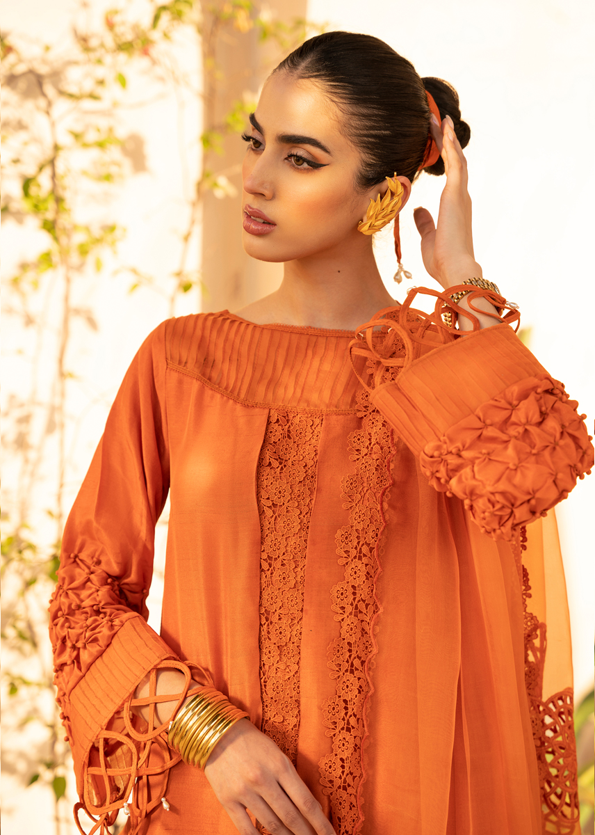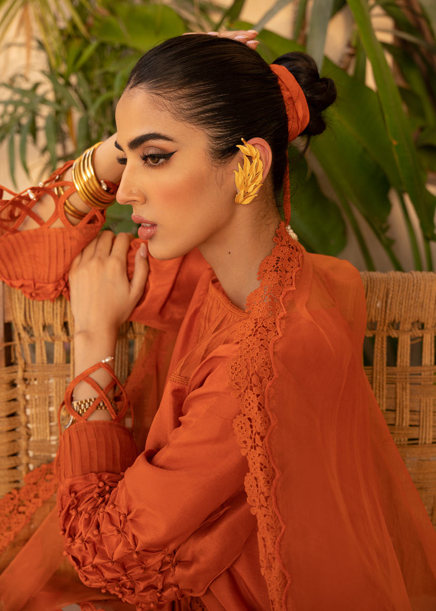 The name aplty reflects it's captivating appeal making it a versatile choice for accasion of sorts. It captures the earthy warmth of terracotta background infused with a touch of magic through the vibrant blue embroidery on both the dupatta and shirt. Adding to the allure of this ensemble are the fabric texturing, lace finishings, pleating and elements of layering lending a unique depth and dimension adding a feminine charm and refined aesthetics.