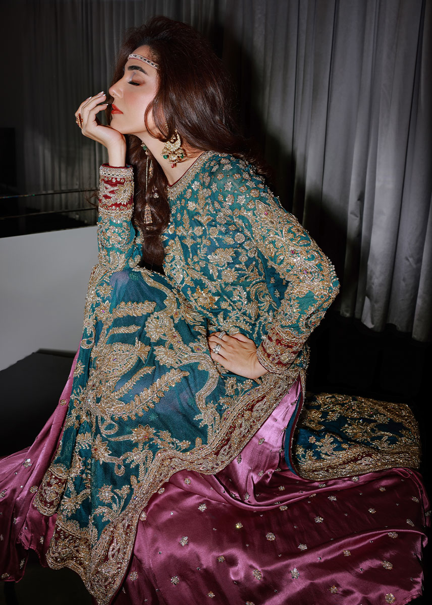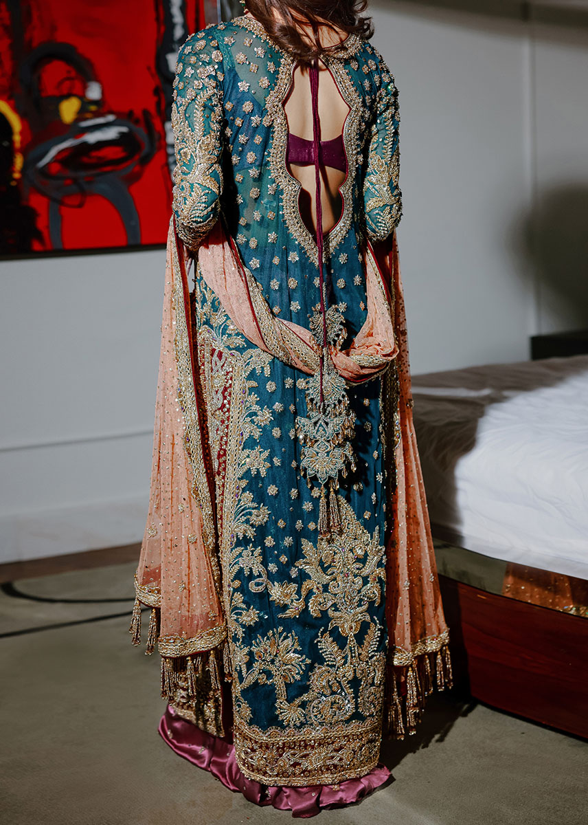 The centerpiece of the outfit is a deep Persian teal shirt, intricately adorned with golden zardosi and tilla embroidery. The detailed floral and geometric patterns evoke a sense of grandeur, while the lustrous embellishments add a luminous glow, making this piece a true work of art.